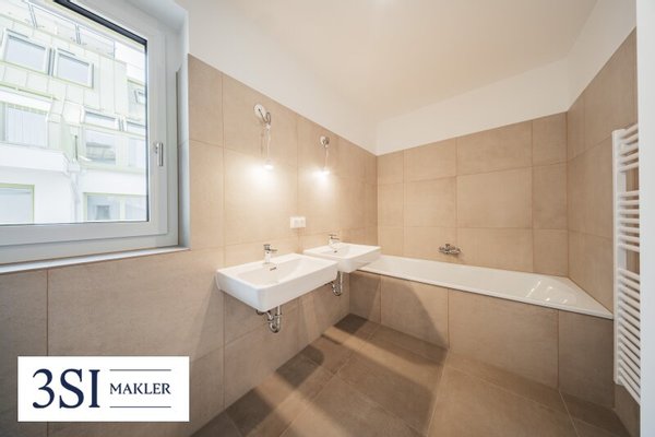 - Badezimmer mit Badewanne, Doppelwaschbecken und WC