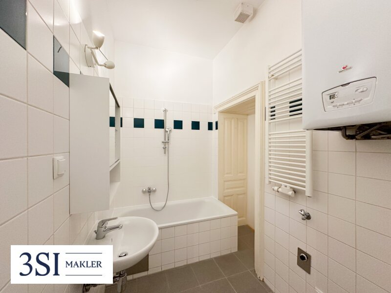 - Badezimmer mit Badewanne und Waschmaschinenanschluss
