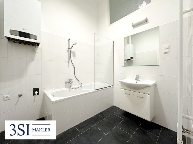 - Badezimmer mit Badewanne und Waschmaschinenanschluss