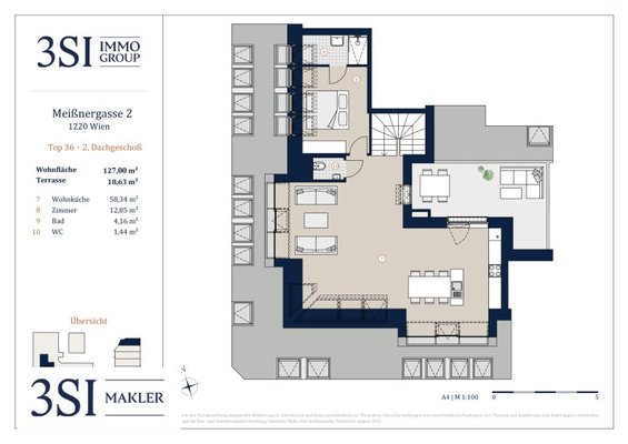 Dieses traumhafte Penthouse besitzt eine Größe von ca. 126 m² Wohnfläche, und eine knapp 19m² Terrasse auf Wohnebene. Die Aufteilung ist wie folgt: