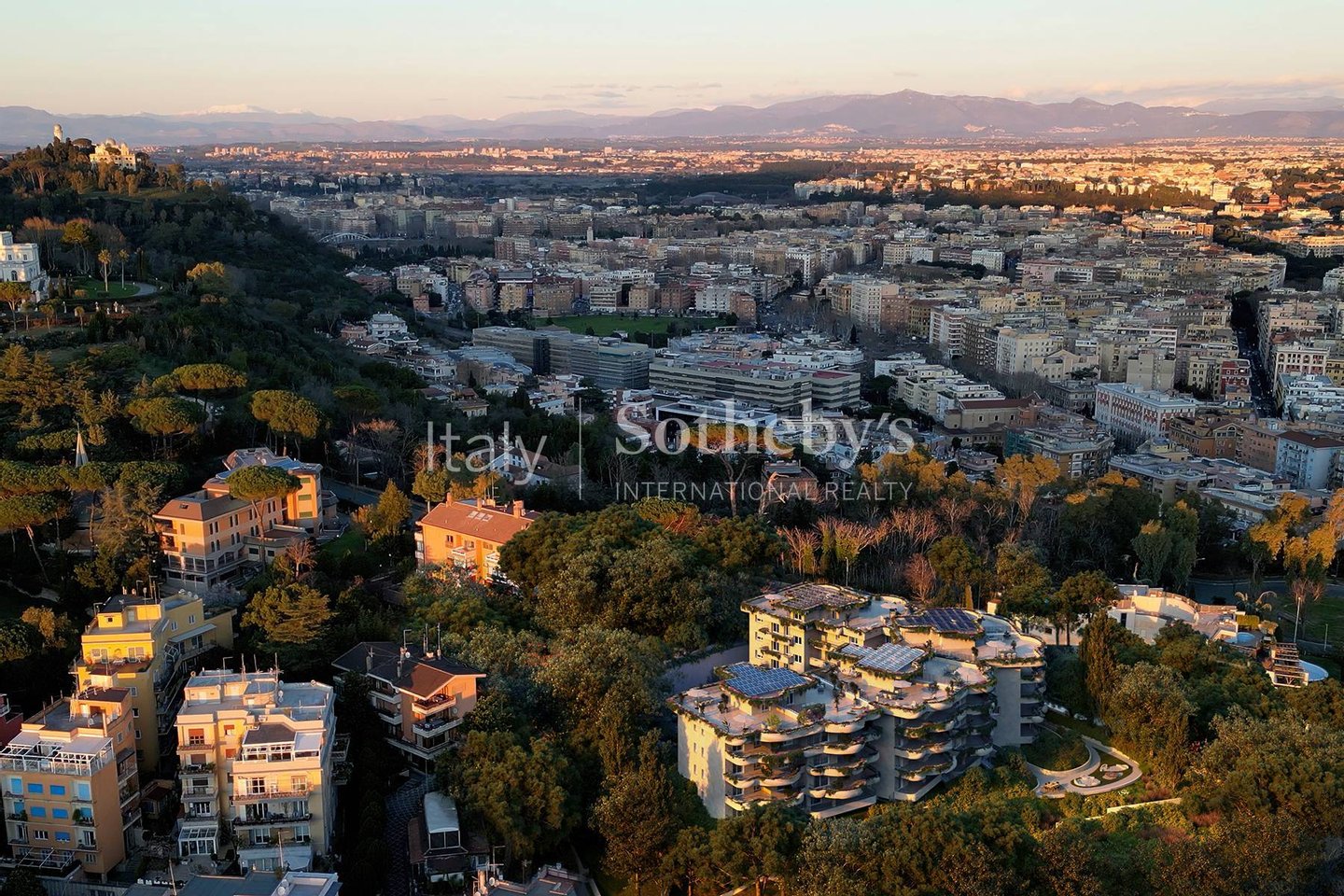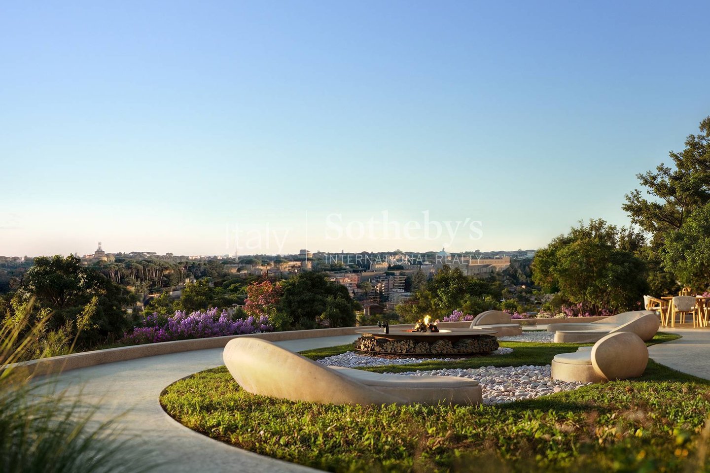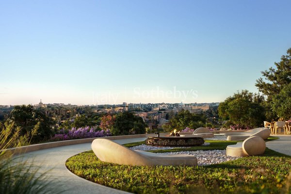 Die Apartments verfügen über Fußbodenheizung, Klimaanlage, Smart-Home-Technologie und eine Vorrüstung für Alarmsysteme. Das Gebäude bietet exklusive Dienstleistungen wie einen Entspannungsbereich mit Blick auf Rom, einen privaten Park, einen Fitnessraum, einen Paketannahmebereich und einen Concierge-Service. Ein Kellerraum und Garagenplätze können separat erworben werden. Geplante Fertigstellung: zweites Quartal 2026. Ref. B13