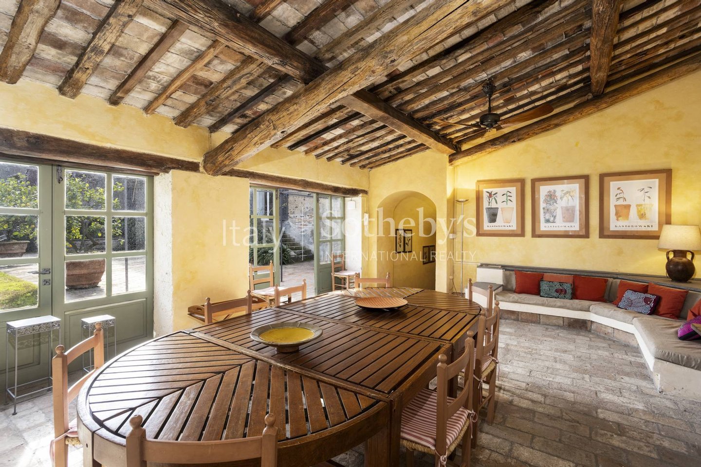 Das Hauptgeschoss beeindruckt mit einem majestätischen Eingangsbereich mit Kamin, der in einen großzügigen Salon führt. Dieser ist mit sichtbaren Holzbalkendecken, Kaminen und einer eleganten Bibliothek ausgestattet. Die möblierte Veranda öffnet sich direkt zu den Gärten und schafft einen idealen Bereich für Mahlzeiten und entspannte Momente.