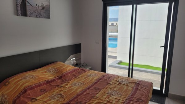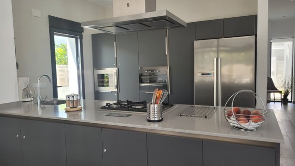 Das Innere der Villa zeichnet sich durch ein großes Wohnzimmer mit Essbereich aus, das dank großer Fenster viel natürliches Licht hereinlässt, und einen Holzofen, der in den Wintermonaten für zusätzliche Wärme sorgt. Die offene Küche mit einer großzügigen Insel ist mit hochwertigen Geräten ausgestattet und ideal für Kochliebhaber. Es gibt drei Doppelzimmer, alle mit Einbauschränken, Klimaanlage und Deckenventilatoren, die direkten Zugang zum Außenbereich bieten. Das Hauptschlafzimmer verfügt über ein eigenes Badezimmer, während die anderen beiden Schlafzimmer ein komplettes Badezimmer sowie ein zusätzliches Gäste-WC teilen.