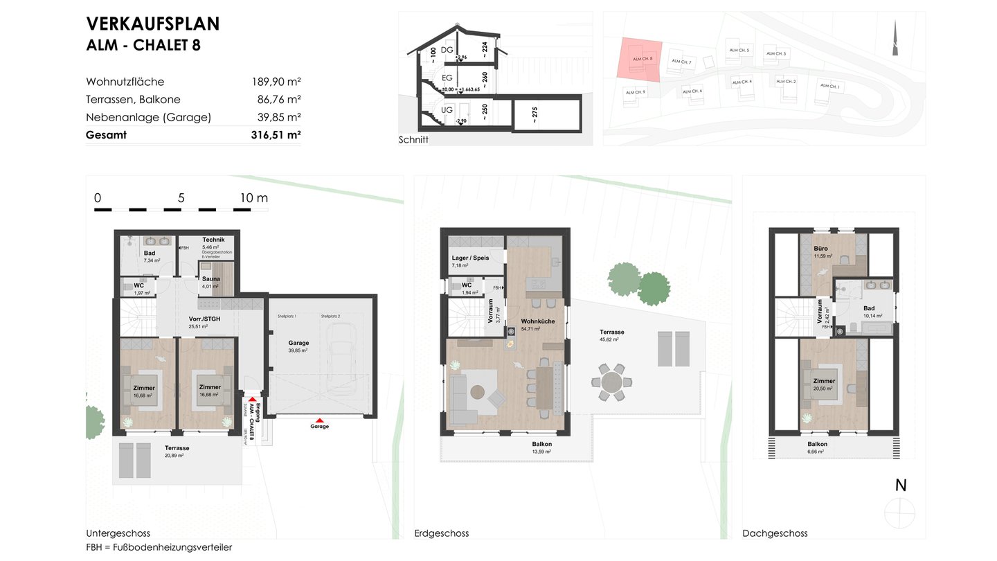 Alle 9 Chalets verfügen über zwei bis vier Schlafzimmer, 1 bis 2 Bäder sowie über eine Sauna und 2 Garagen- oder Carportstellplätze und werden auf eigenen, großzügigen Grundparzellen errichtet und sind somit komplett unabhängig voneinander.