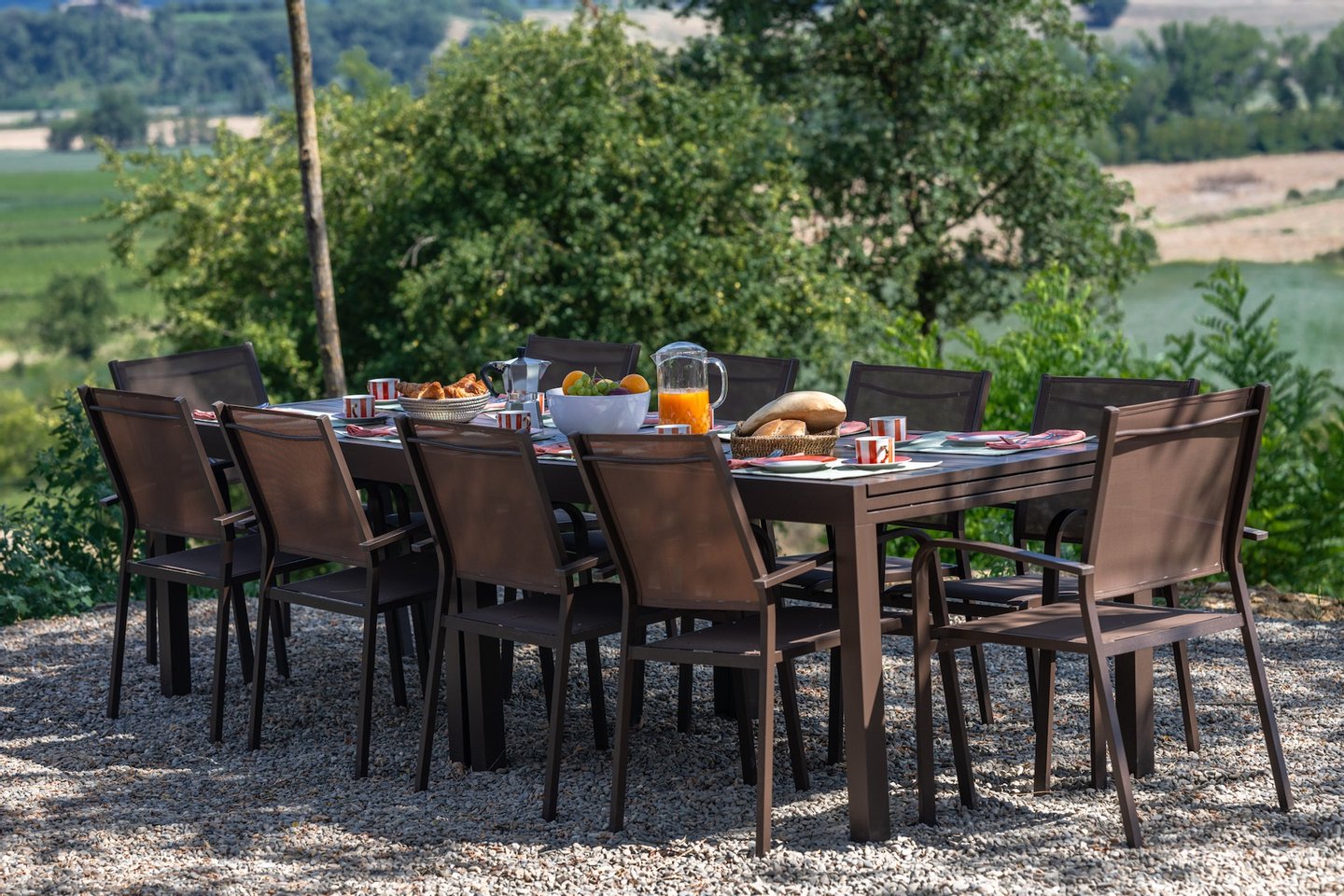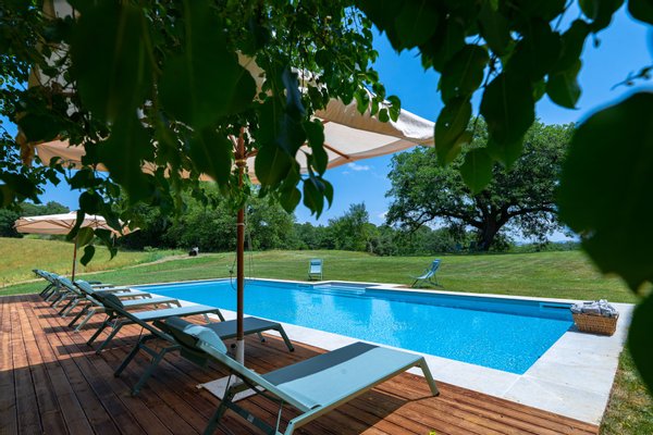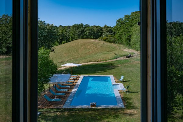The meticulously landscaped garden boasts a 15-meter swimming pool, an outdoor barbecue, a bocce court, and several seating areas, all strategically placed to showcase the unforgettable vistas of the surrounding countryside.