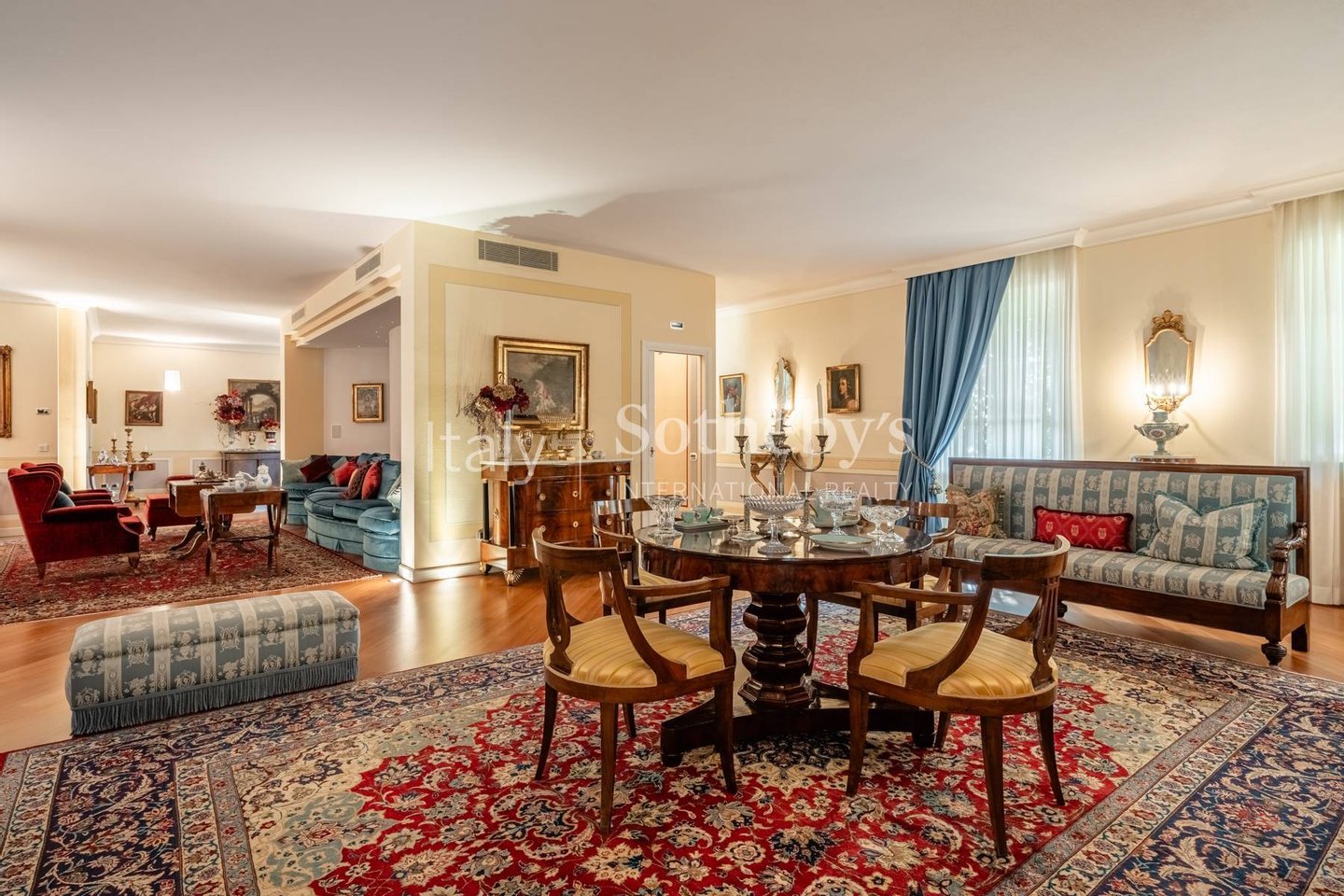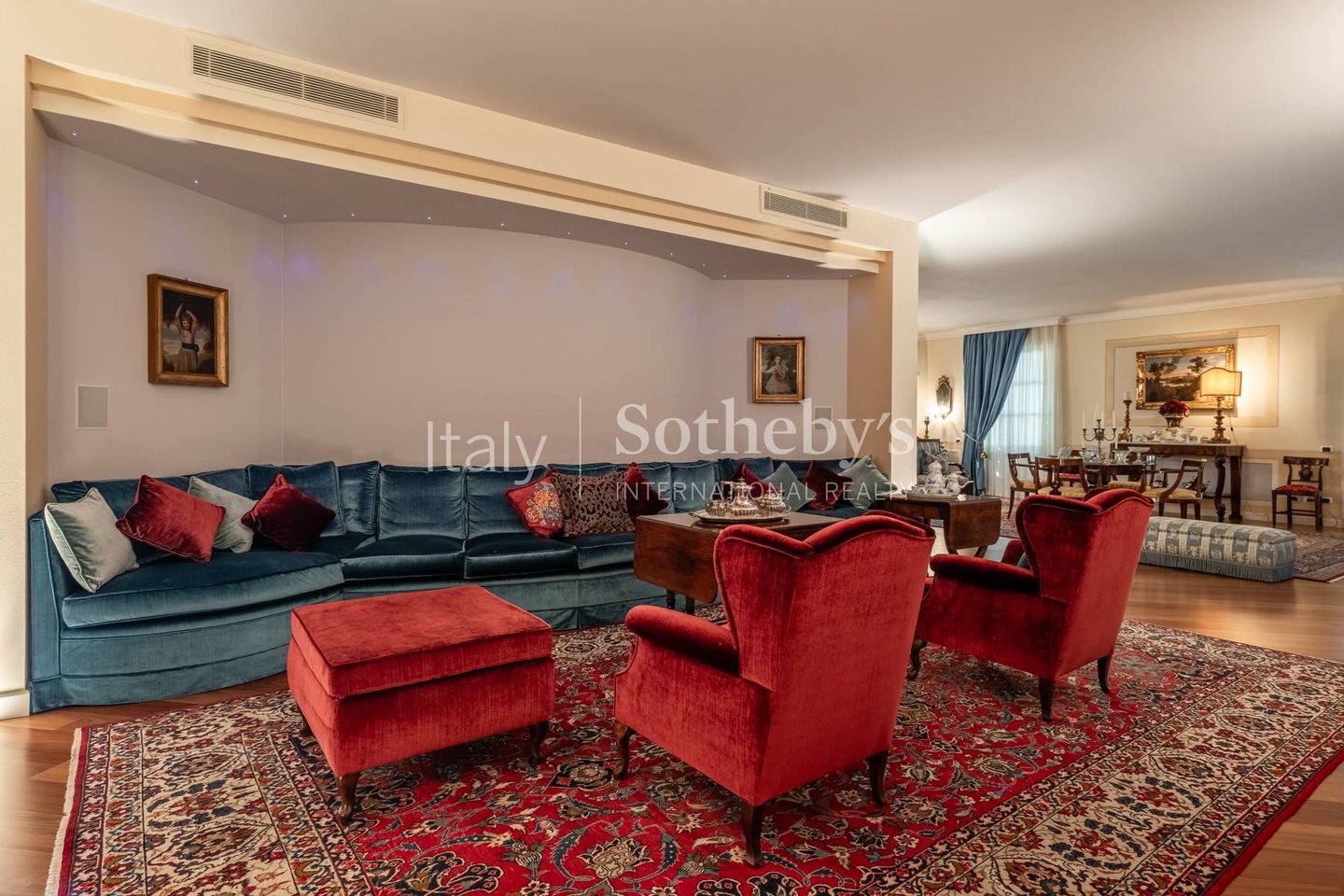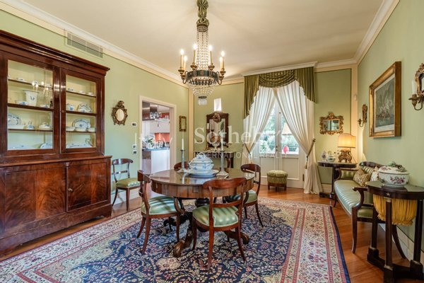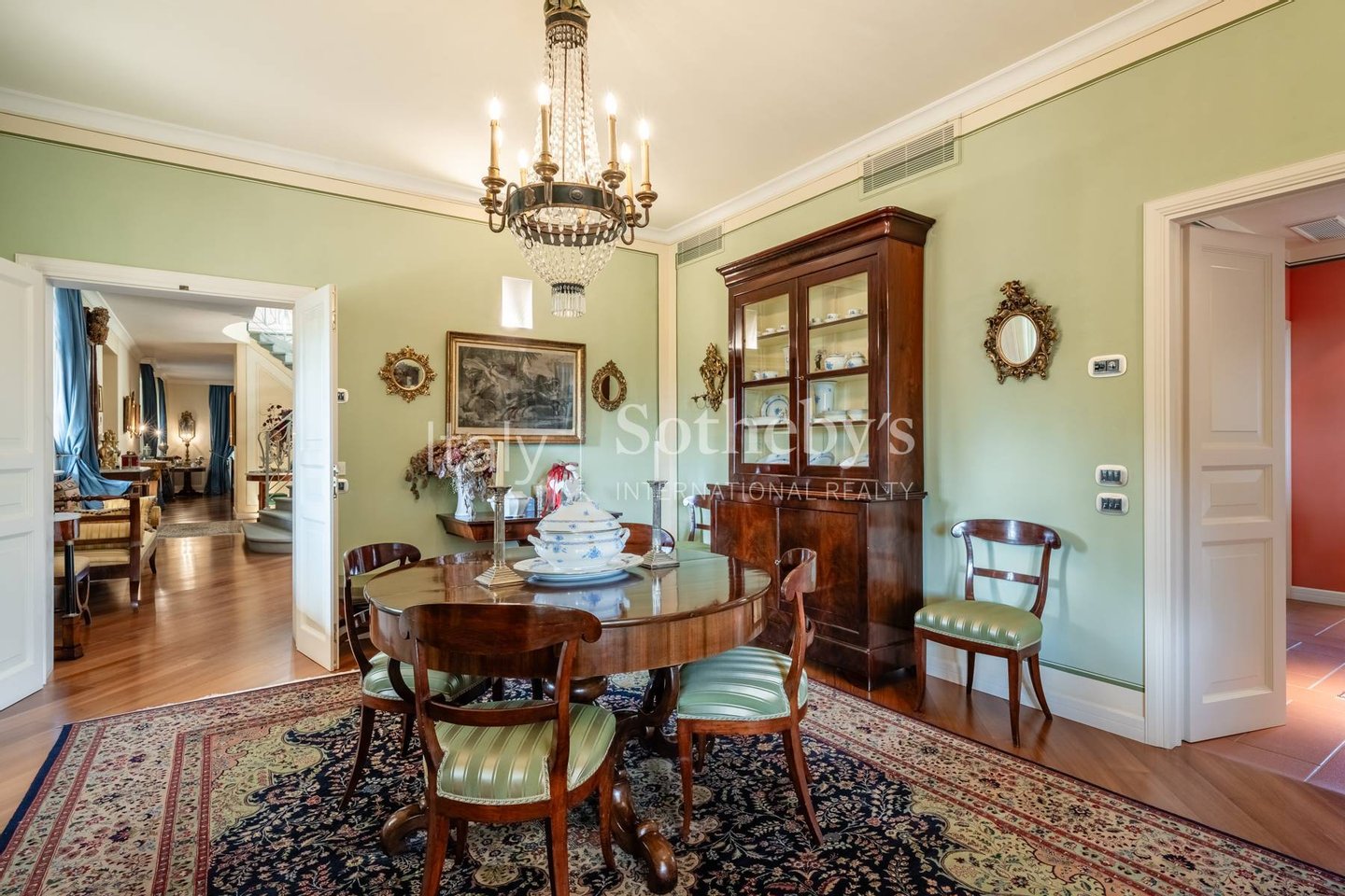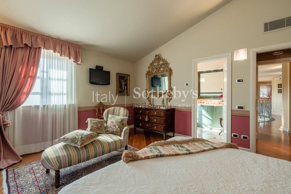 Ein von Zypressen gesäumter Weg führt zum Haupteingang der Villa, die sich über drei Ebenen erstreckt und eine Gesamtfläche von etwa 700 m² umfasst. Hochwertige Materialien wie Terrakotta und Parkett, Marmorbäder sowie maßgefertigte Möbel verleihen dem Anwesen besonderen Charme. Im Erdgeschoss befinden sich ein repräsentatives Wohnzimmer, ein Esszimmer und eine voll ausgestattete Küche mit Office-Bereich und direktem Zugang zum Außen-Essbereich. Ebenfalls auf dieser Etage befinden sich ein Arbeitszimmer, ein Gäste-WC und ein Hauswirtschaftsraum.