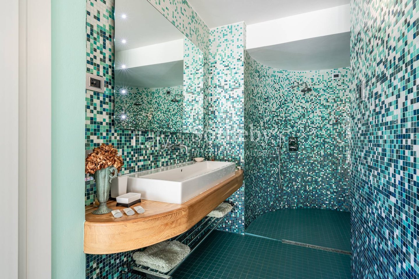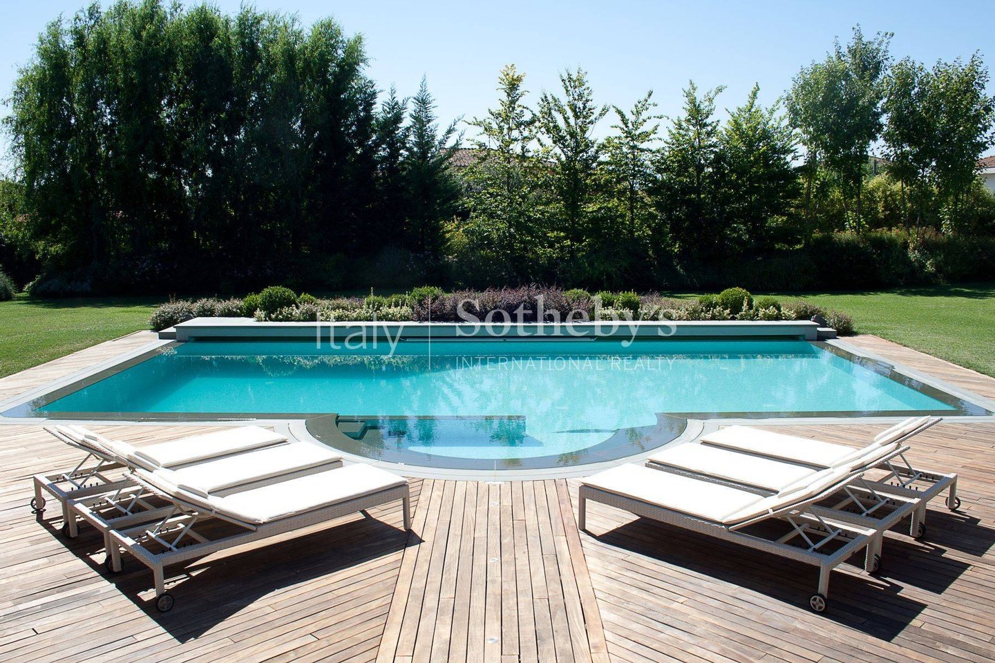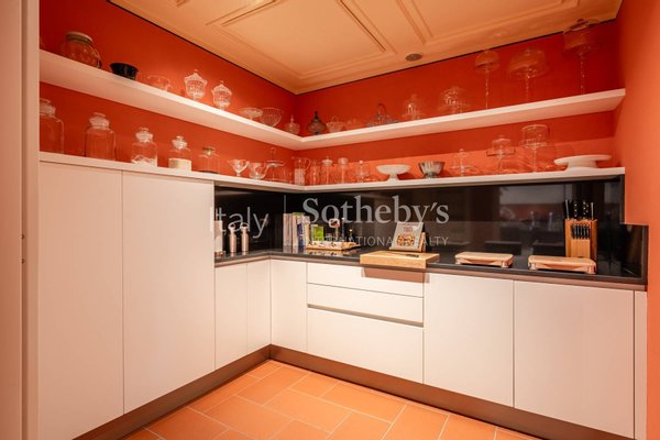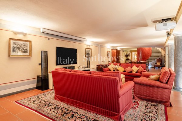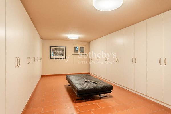 Im Untergeschoss, das sowohl von innen als auch von außen zugänglich ist, befindet sich ein großer offener Bereich mit einem Wohnzimmer mit Kamin, einer Küche mit Holzofen und einem praktischen Weinkeller. Der Wellness- und Fitnessbereich, der sich zum Garten hin öffnet, ist mit modernen Geräten ausgestattet und bietet einen direkten Blick auf den Pool.