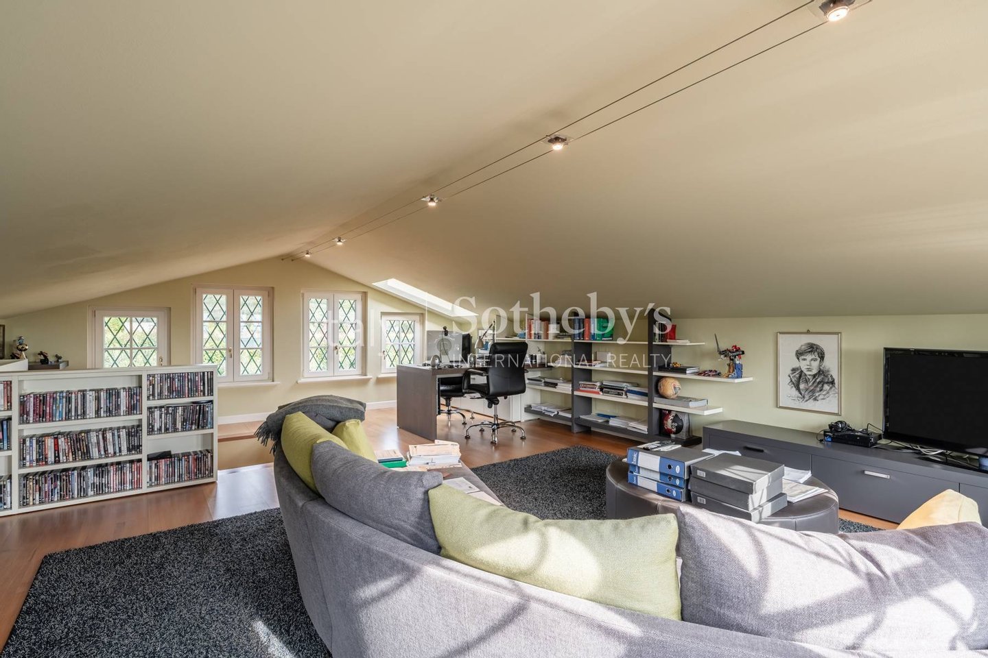 Eine Steintreppe führt in das erste Obergeschoss, das den Schlafbereich beherbergt. Hier gibt es vier großzügige Schlafzimmer, jedes mit eigenem Bad. Das Hauptschlafzimmer verfügt über einen geräumigen begehbaren Kleiderschrank und direkten Zugang zur Panoramaterrasse, die einen bezaubernden Blick auf die umliegende grüne Landschaft bietet. Das Dachgeschoss im obersten Stockwerk eignet sich ideal als Arbeits- oder TV-Bereich.