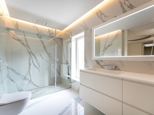 -WCs mit italienischen Materialien von ANTONIO LUPI, mit modernen Duschen und Farbtherapie, mit VILLEROY & BOCH Sanitärkeramik, Spültoiletten und Betätigungsplatten und VIEGA Duschrinnen, FOURSTEEL Handtuchhalter, mit Heizung.