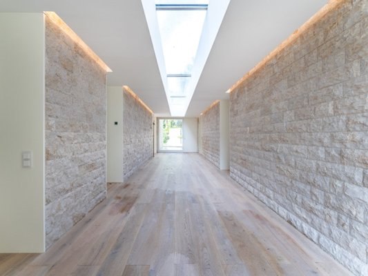 Mit 500 m2 Bruttobaufläche und 350 m2 Bruttoprivatfläche verfügt das Anwesen über zwei getrennte Bereiche, Soziales und Service, die durch eine weitläufige Halle mit einem Längsoberlicht verbunden sind.