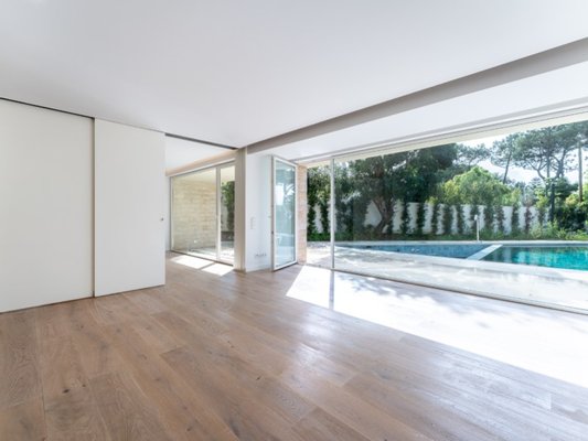 -Master Suite mit 65 m2, die durch Schiebetüren, Schrank, Flur und komplettes Badezimmer in ein Schlafzimmer und ein Büro unterteilt werden kann, mit direktem Zugang zum Pool und viel natürlichem Licht, aufgrund der großen Fenster.