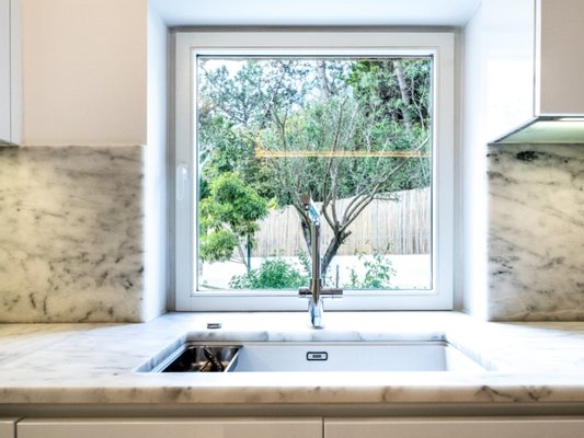 -Küche mit einer Größe von 38 m2 im italienischen SCIC-Design, komplett ausgestattet mit hochwertigen Geräten, mit einer Insel mit Estremoz-Marmorstein, CORIAN DUPONT-Platten, TOSCOQUATTRO- und BONGIO-Armaturen.