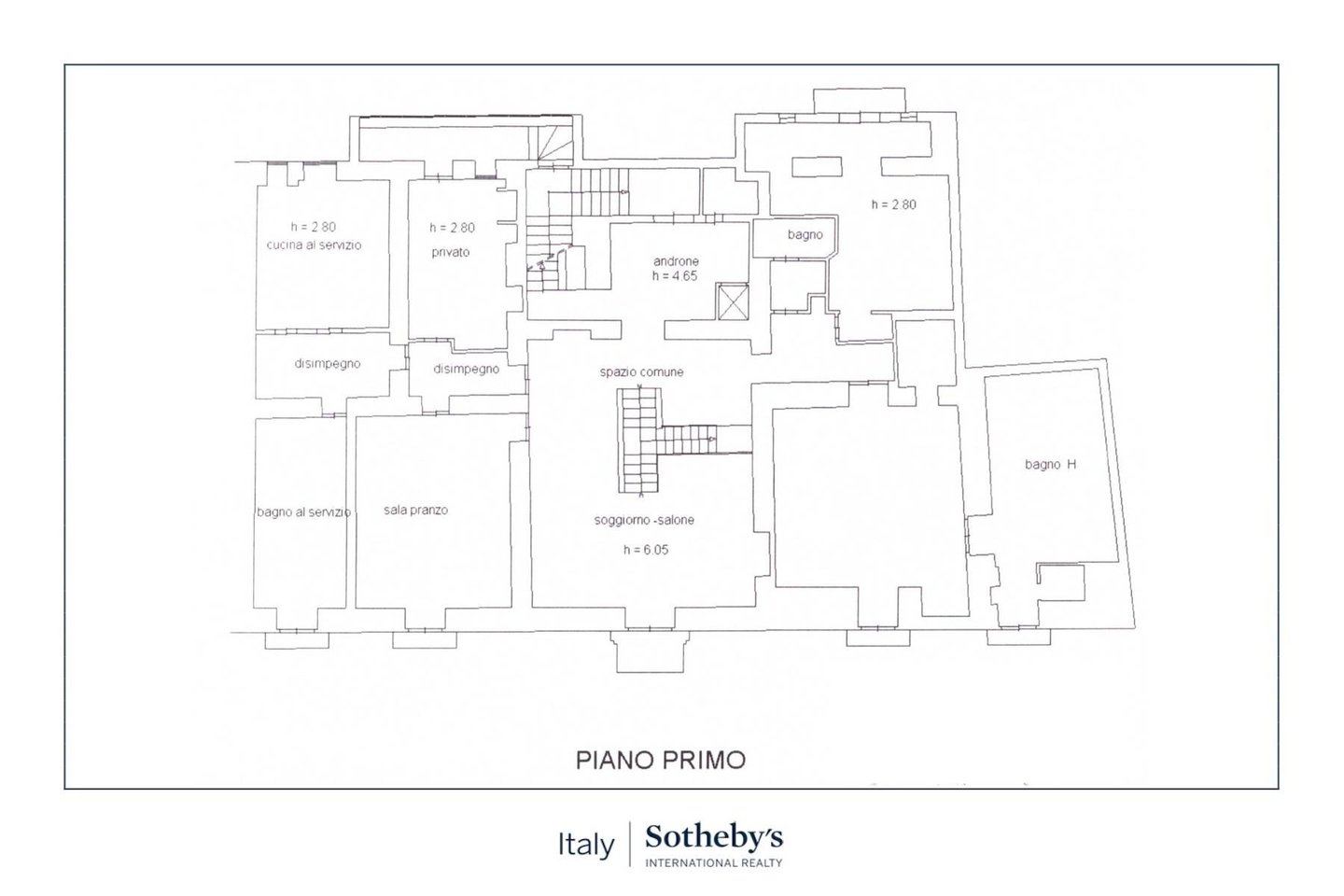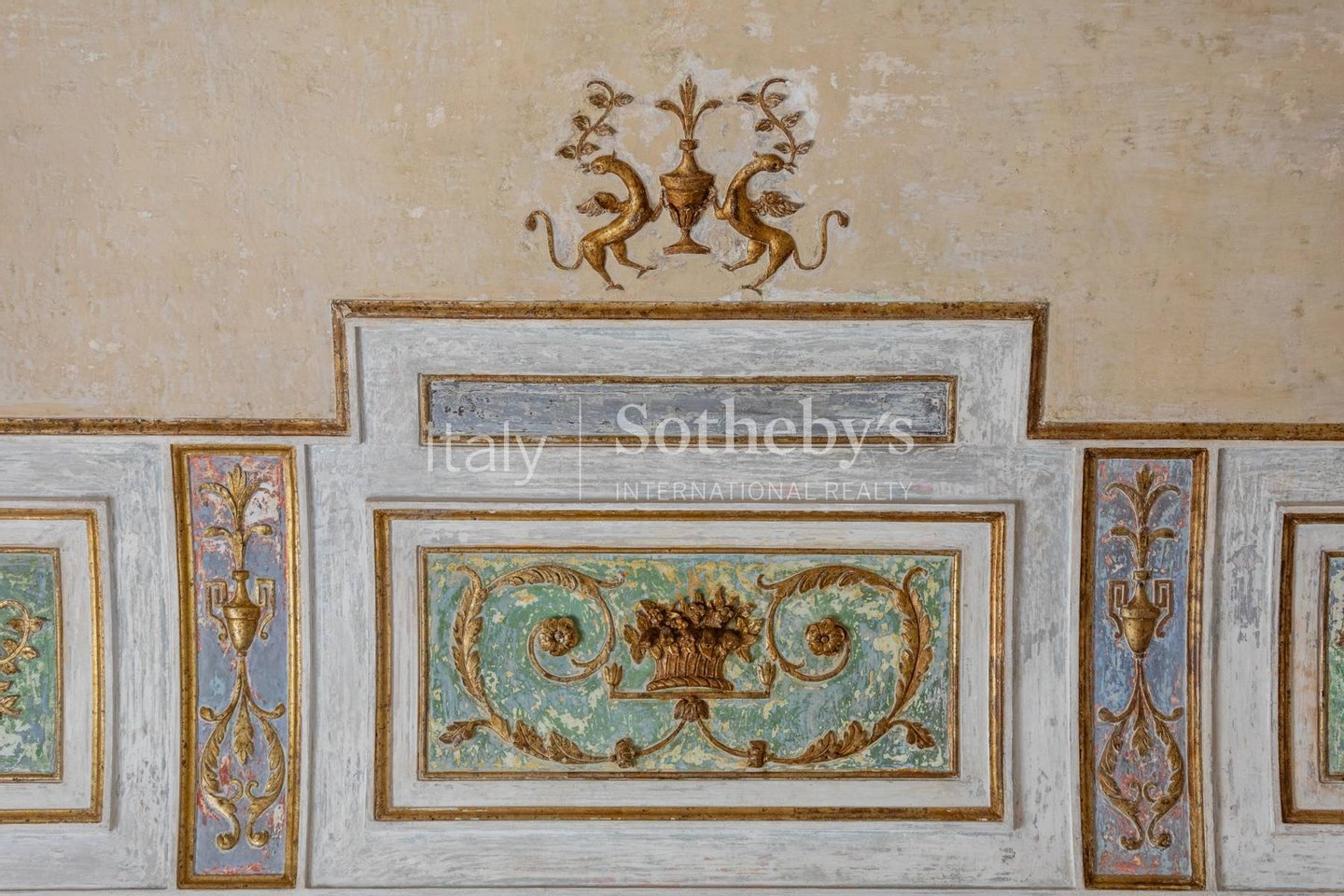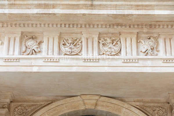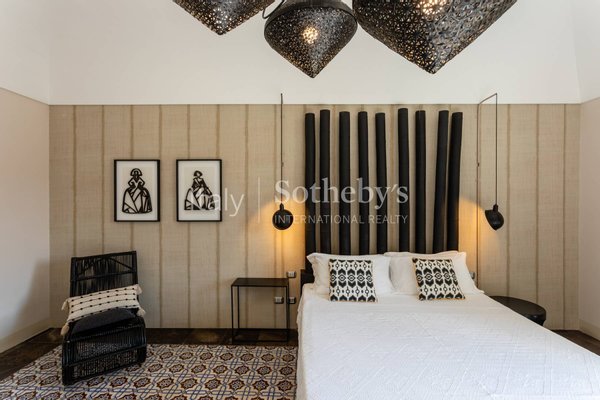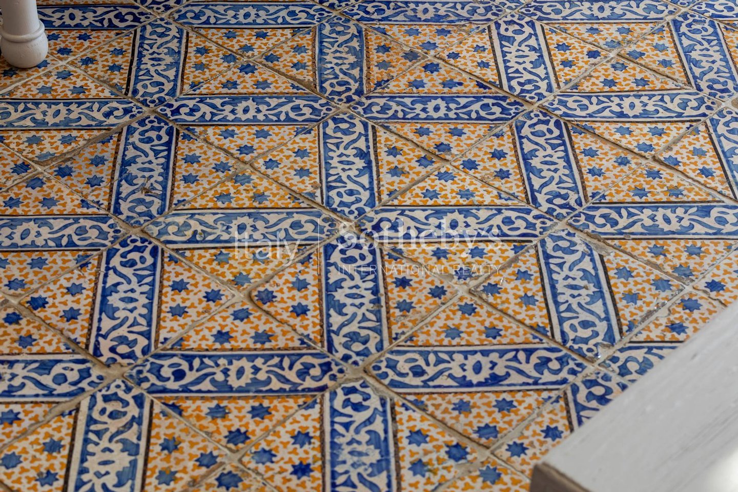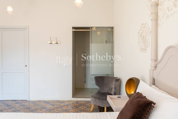 Das Gebäude erstreckt sich über drei Etagen. Im Erdgeschoss empfängt ein imposanter Eingang mit einer prächtigen Steingewölbedecke und einer eleganten Treppe aus Caltagirone-Keramik die Besucher. Diese führt in das Piano Nobile, wo sich ein stilvolles Apartment befindet. Hier umfasst der Wohnbereich ein großzügiges Wohnzimmer mit einer Zwischengalerie, von der aus die kunstvoll bemalten Deckenfresken aus nächster Nähe bewundert werden können. Neben dem Wohnzimmer befinden sich ein einladendes Esszimmer, eine geräumige Wohnküche, ein Bürobereich und ein erstes Badezimmer, die den Wohnbereich komplettieren.