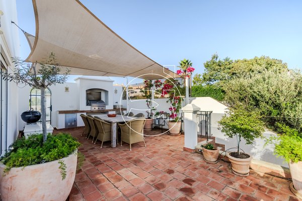 Beim Betreten der Villa führt eine einladende Eingangshalle zu einem gemütlichen Wohnzimmer mit offenem Kamin und einem hellen Essbereich, die beide Zugang zu einer großen Terrasse mit elektrischem Markisendach haben.