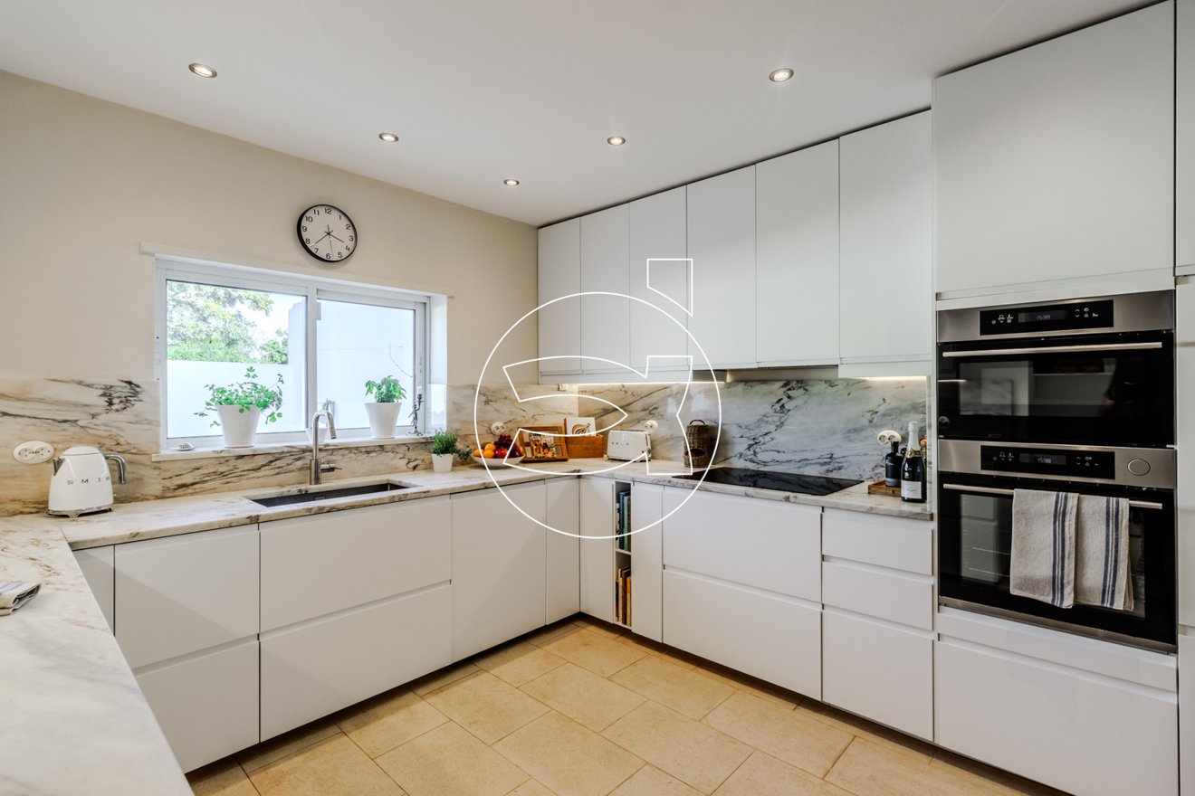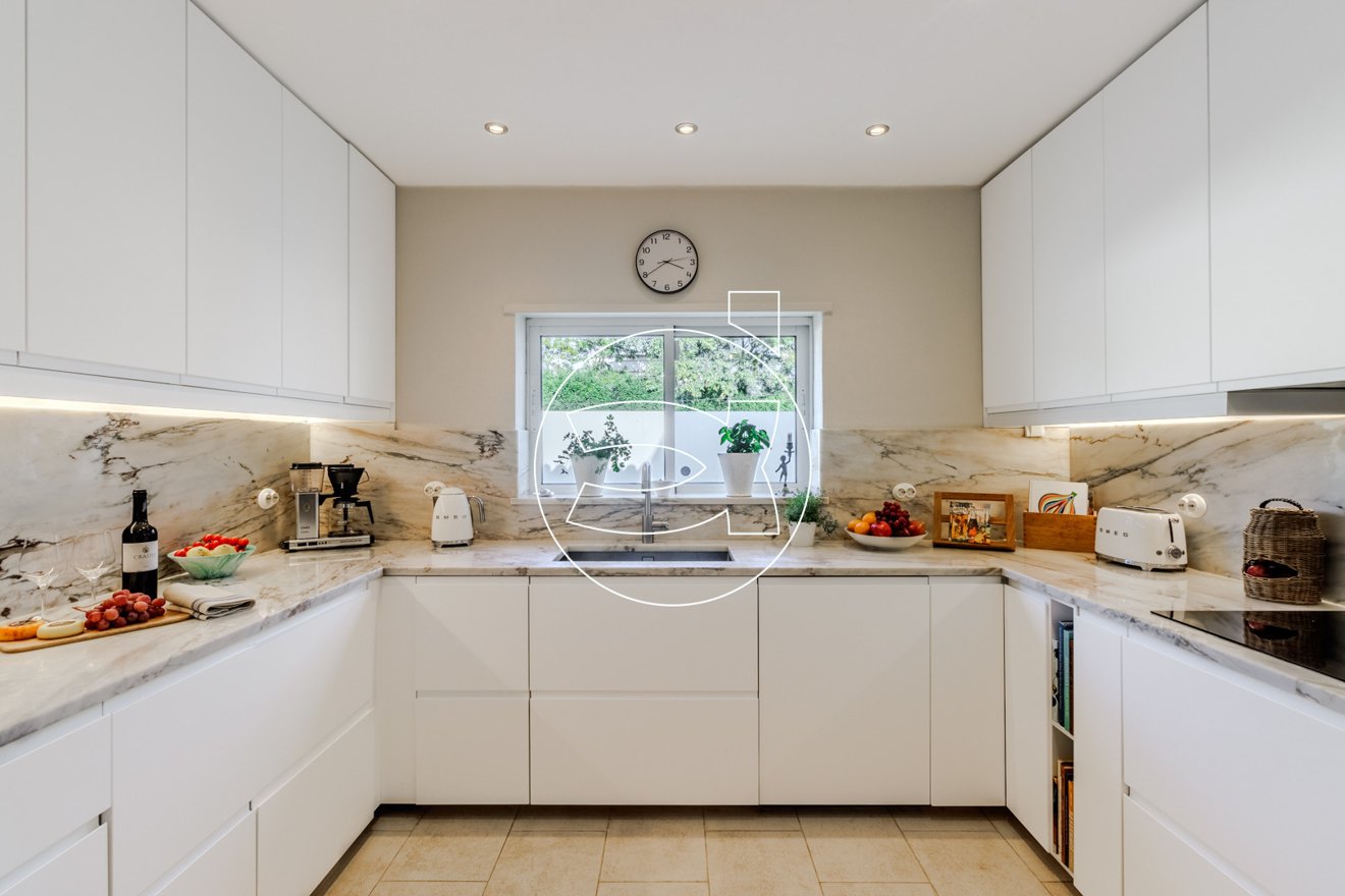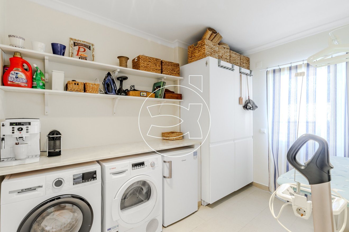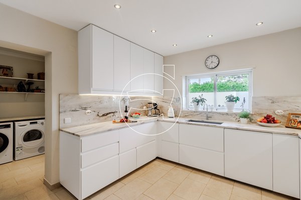 Auf der Eingangsebene befinden sich außerdem eine moderne, voll ausgestattete Küche mit hochwertigen Geräten und ein separater Hauswirtschaftsraum mit viel Stauraum.