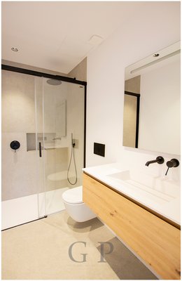 Vom Wohnraum gelangen Sie in den Schlafbereich des Erdgeschosses. Hier stehen Ihnen drei Schlafzimmer zur Verfügung, jeweils mit Badezimmer en-suite und mit Zugang in den Garten. Daneben befindet sich die Gäste Toilette auf dieser Ebene, die zusätzlich als drittes Duschbad dient.