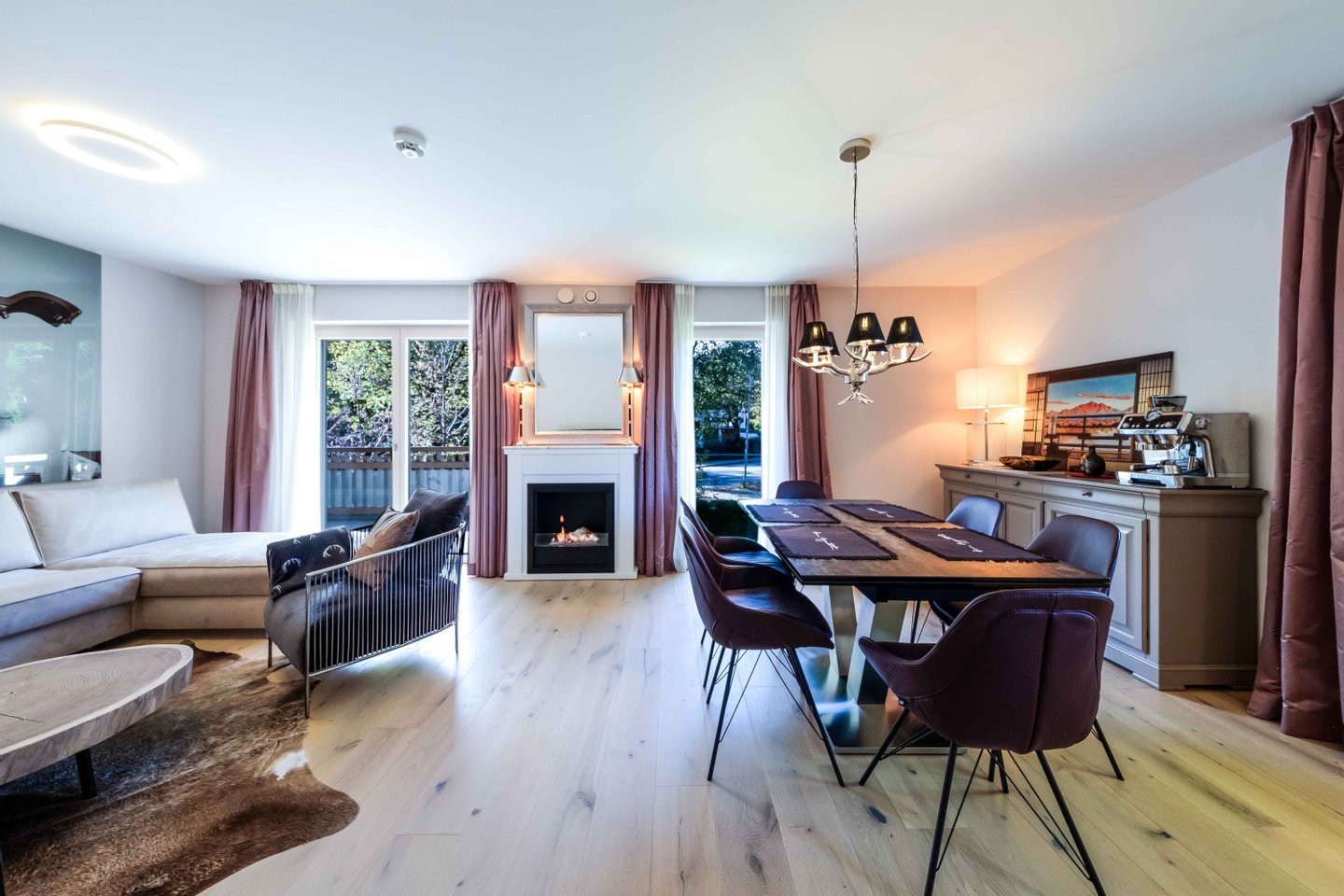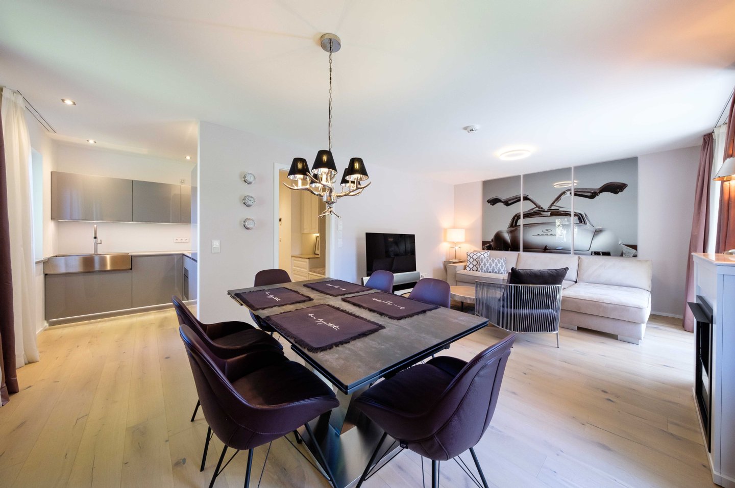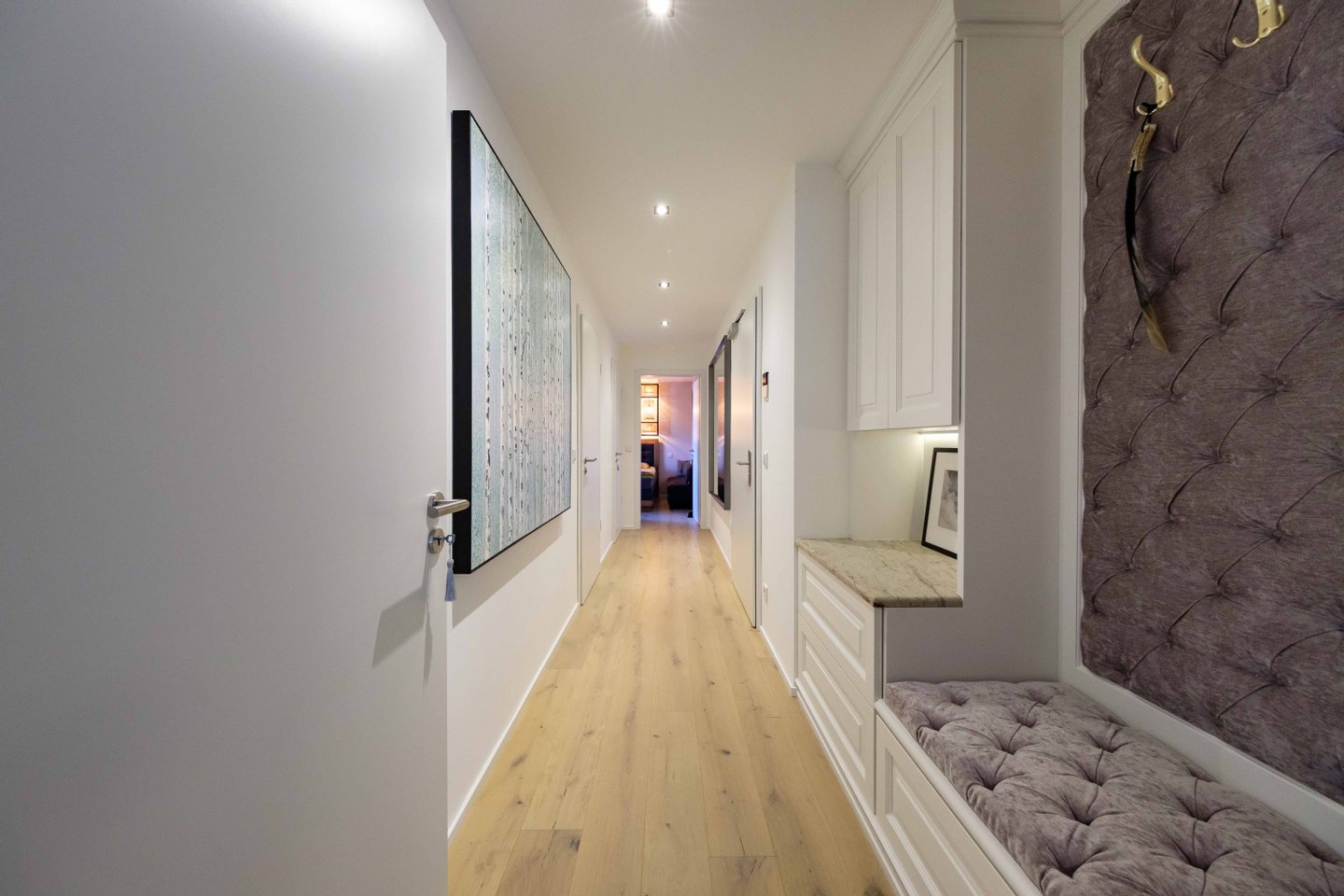 Beim Innenausbau der Wohnung wurde großer Wert auf modernen Wohnkomfort in entspannender Atmosphäre gelegt. Die Verwendung von Holzböden und feinen Textilien schaffen ein harmonisches Ambiente. Maßgefertigte Einbauschränke und eine hochwertige Einbauküche sorgen für eleganten Stauraum.