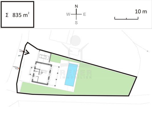 Im Erdgeschoss befindet sich das Wohnzimmer mit der offenen Küche und dem Esszimmer. Zudem wurde auf dieser Ebene an ein Gäste-WC und einen nützlichen Abstellraum gedacht. Vom Wohnraum aus gelangen Sie auf die zwei überdachten Terrassen. Im Garten erwartet Sie ein rechteckiger Pool umgeben von Grünfläche. Insgesamt verfügen Sie über ein 835 m² großes Grundstück, welches von einer Steinmauer umzäunt wird.