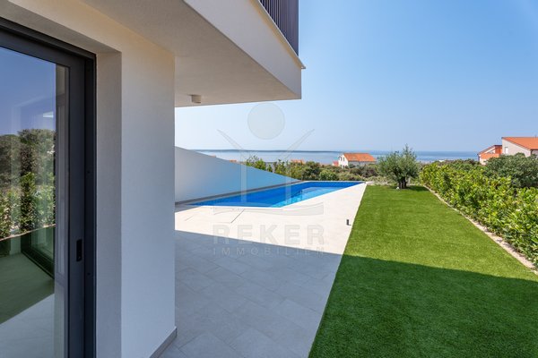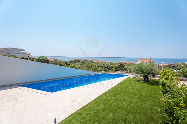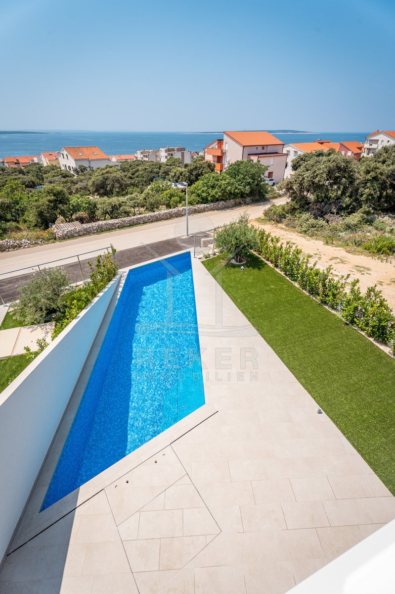 Treten Sie ein in Ihr persönliches Paradies auf der Insel Pag mit diesem exklusiven Neubau-Reihenhaus in Madre! Erleben Sie pure Entspannung in Ihrem eigenen Pool, nur wenige Schritte vom kristallklaren Meer entfernt. Der atemberaubende Meerblick von