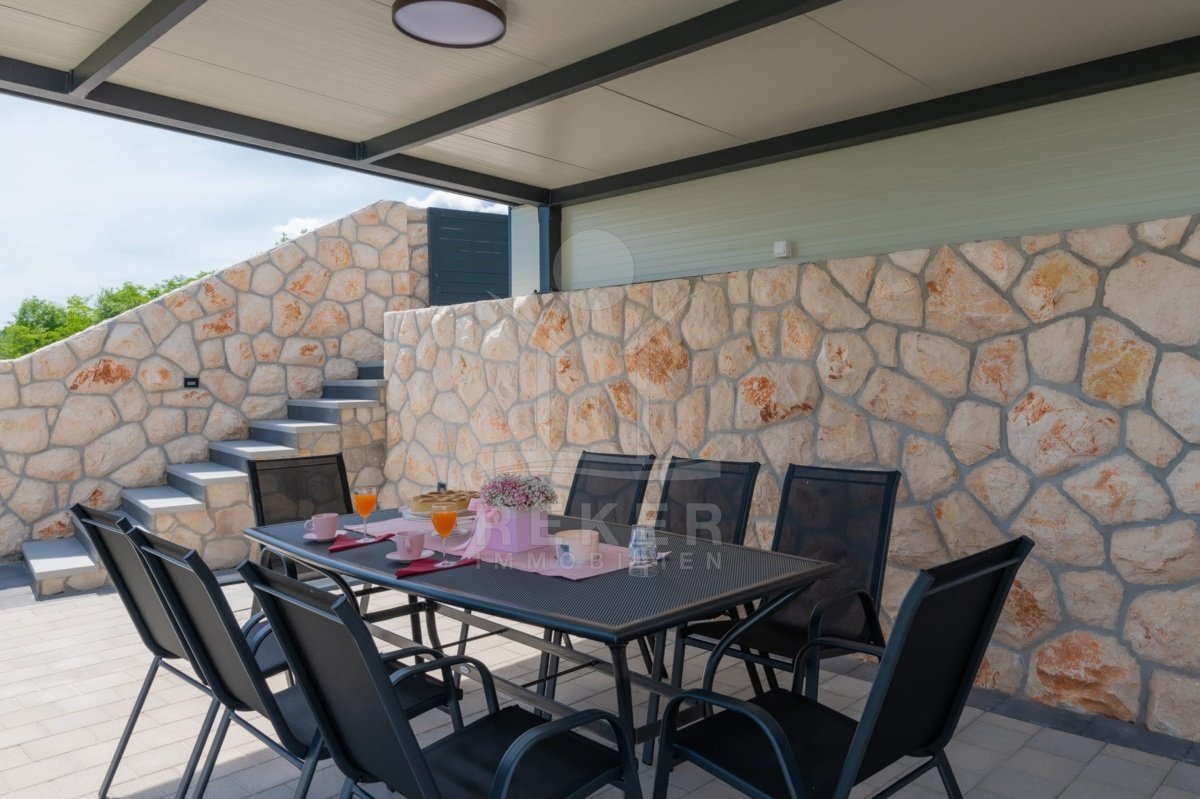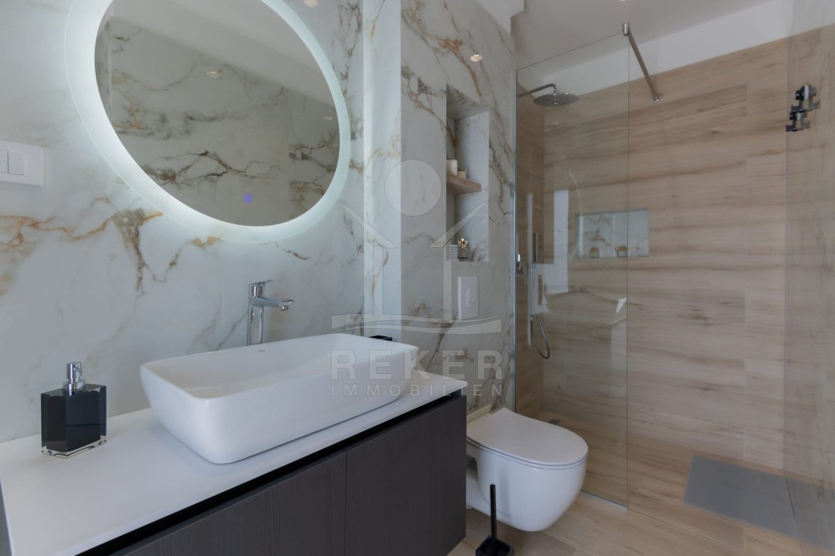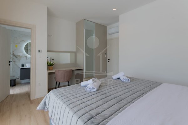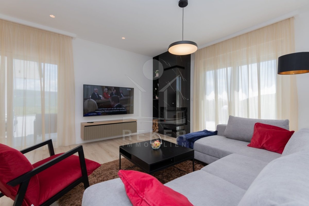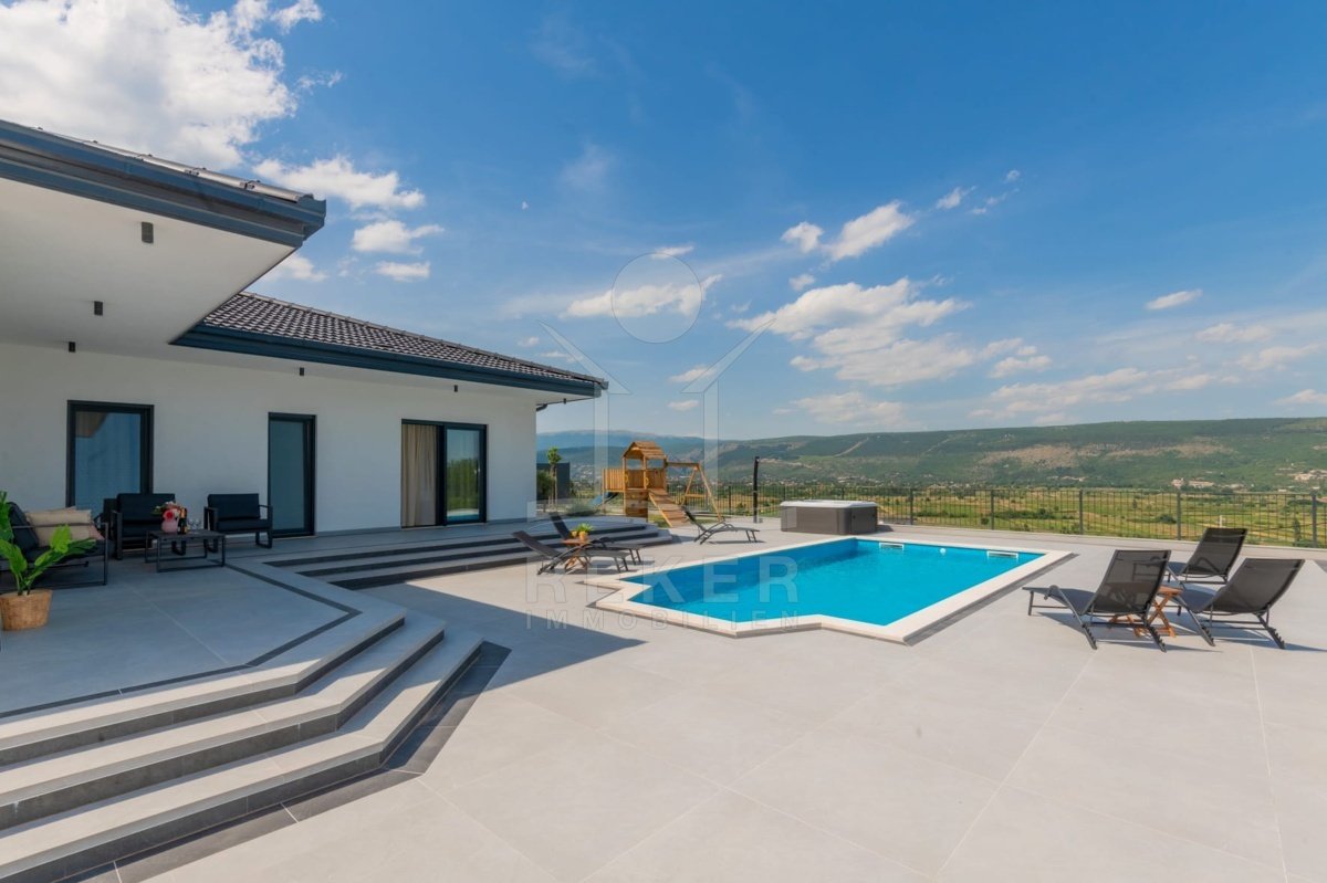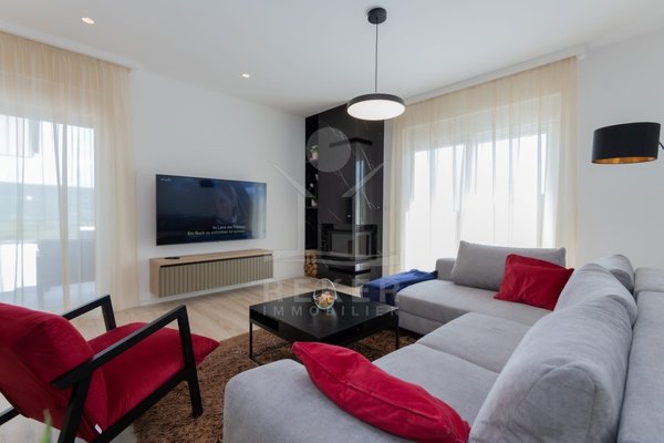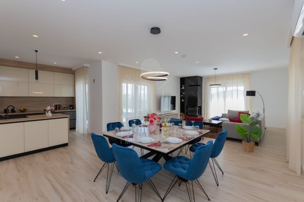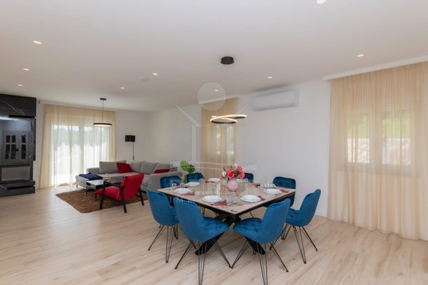 Das Anwesen erstreckt sich über 1200 m² und befindet sich in einer malerischen Lage mit Ausrichtung nach Norden und Osten. Das frei stehende Gebäude überzeugt durch eine elegante Wohnfläche von 195 m² und wurde als Neubau im Jahr 2024 errichtet. Die großzügige Gestaltung der Räume mit einer Deckenhöhe von 3 m sorgt für eine helle und luftige Atmosphäre. Die moderne Fußbodenheizung und die Klimaanlagen in jedem Raum garantieren höchsten Komfort und ein ideales Wohnklima zu jeder Jahreszeit. Im Keller befinden sich ein Technikraum sowie ein ungenutzter Raum von 40 m², der zahlreiche Nutzungsmöglichkeiten eröffnet.