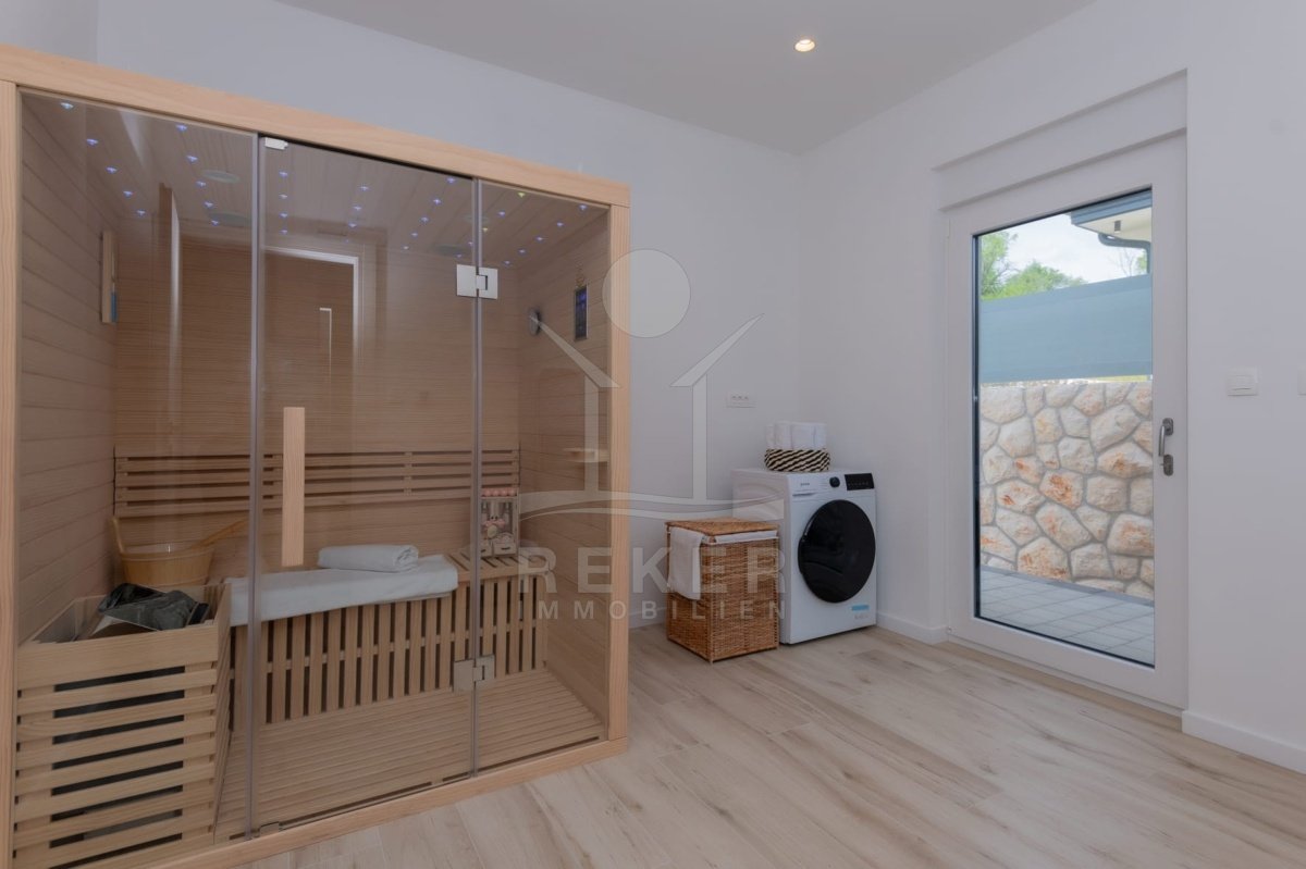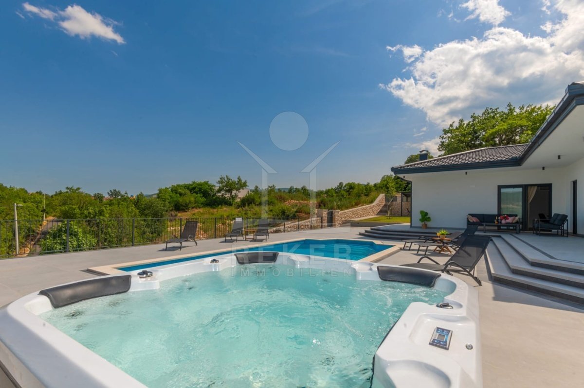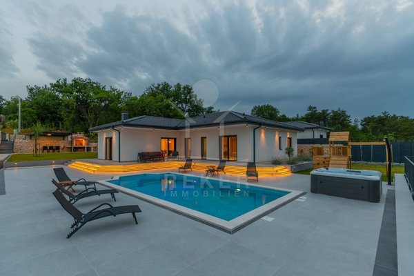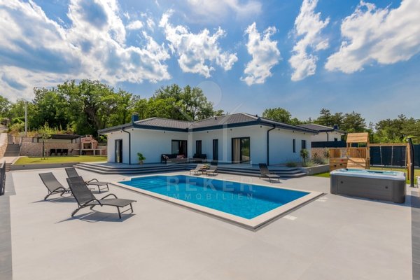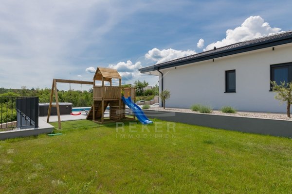 Die Villa verfügt über eine großzügige Terrasse, die Ihnen einen Rückzugsort im Freien bietet. Hier finden Sie einen beheizten Pool mit den Maßen 8x4 m, der zum Entspannen und Schwimmen einlädt, sowie eine Außendusche für Ihre Bequemlichkeit. Zusätzlich gibt es einen luxuriösen Whirlpool und gemütliche Gartenmöbel, die zum Verweilen und Genießen einladen. Eine Außenküche mit Steingrill erweitert den Platz für gesellige Zusammenkünfte und kulinarische Abenteuer im Freien. Die Kombination aus modernem Design und hochwertigen Annehmlichkeiten macht diese Villa zu einem idealen Rückzugsort für die ganze Familie.
