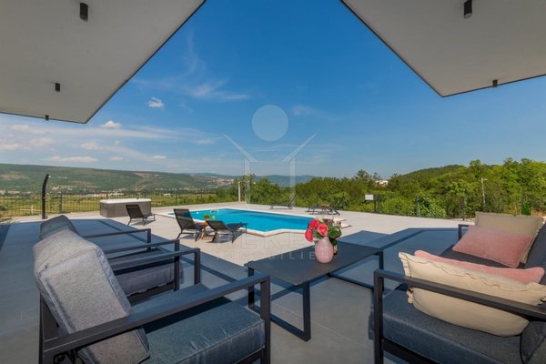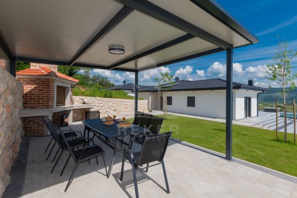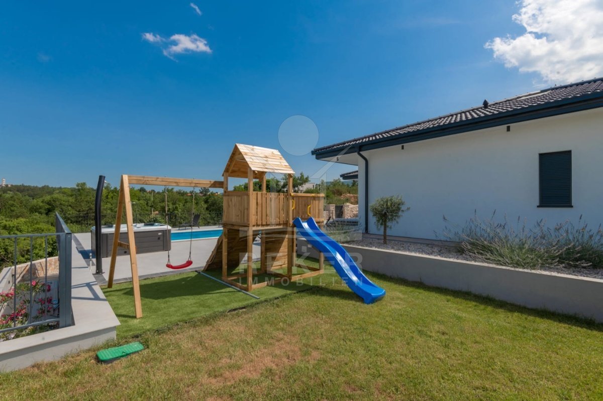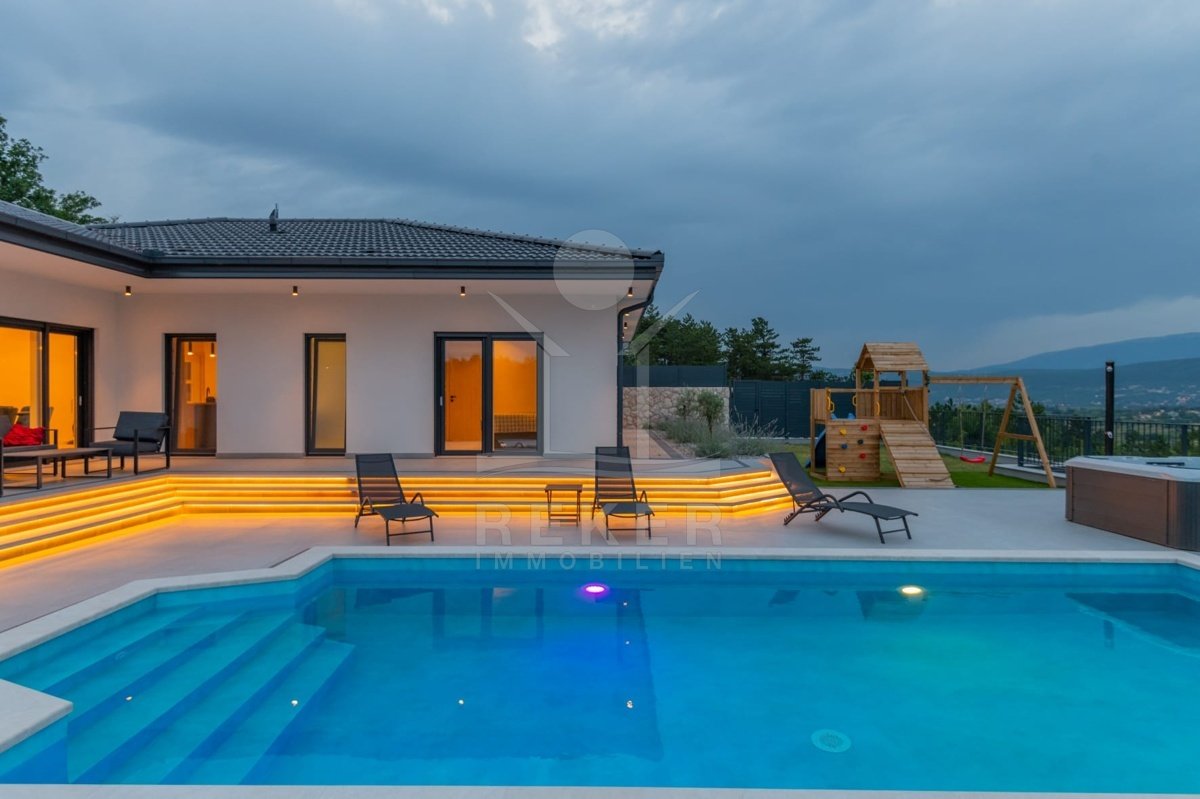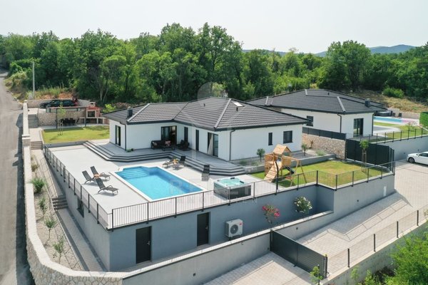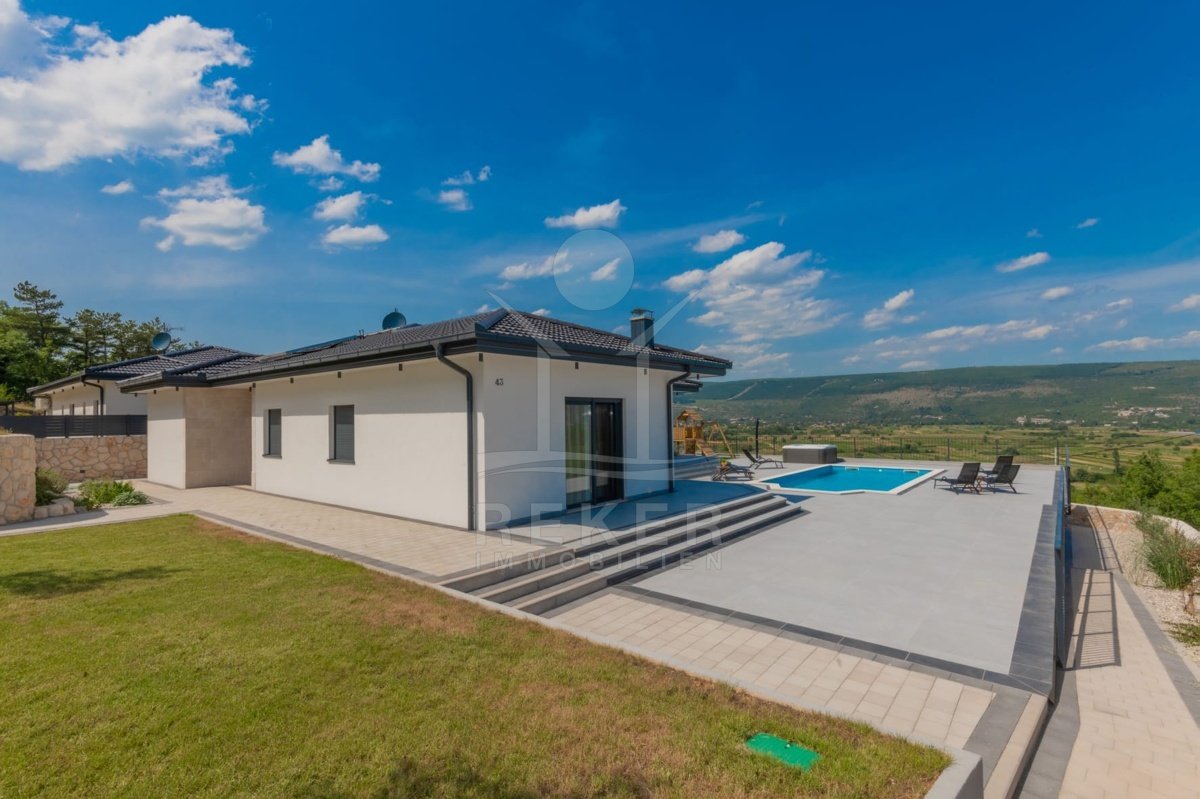 Die Villa verfügt über eine großzügige Terrasse, die Ihnen einen Rückzugsort im Freien bietet. Hier finden Sie einen beheizten Pool mit den Maßen 8x4 m, der zum Entspannen und Schwimmen einlädt, sowie eine Außendusche für Ihre Bequemlichkeit. Zusätzlich gibt es einen luxuriösen Whirlpool und gemütliche Gartenmöbel, die zum Verweilen und Genießen einladen. Eine Außenküche mit Steingrill erweitert den Platz für gesellige Zusammenkünfte und kulinarische Abenteuer im Freien. Die Kombination aus modernem Design und hochwertigen Annehmlichkeiten macht diese Villa zu einem idealen Rückzugsort für die ganze Familie.