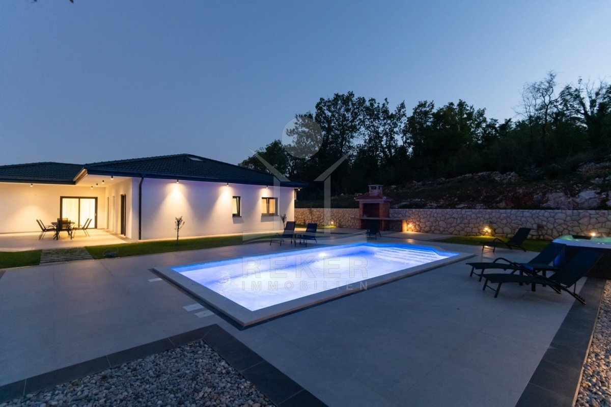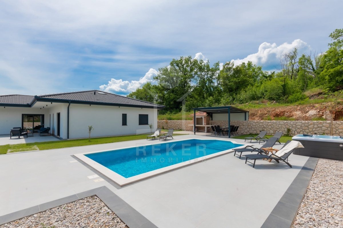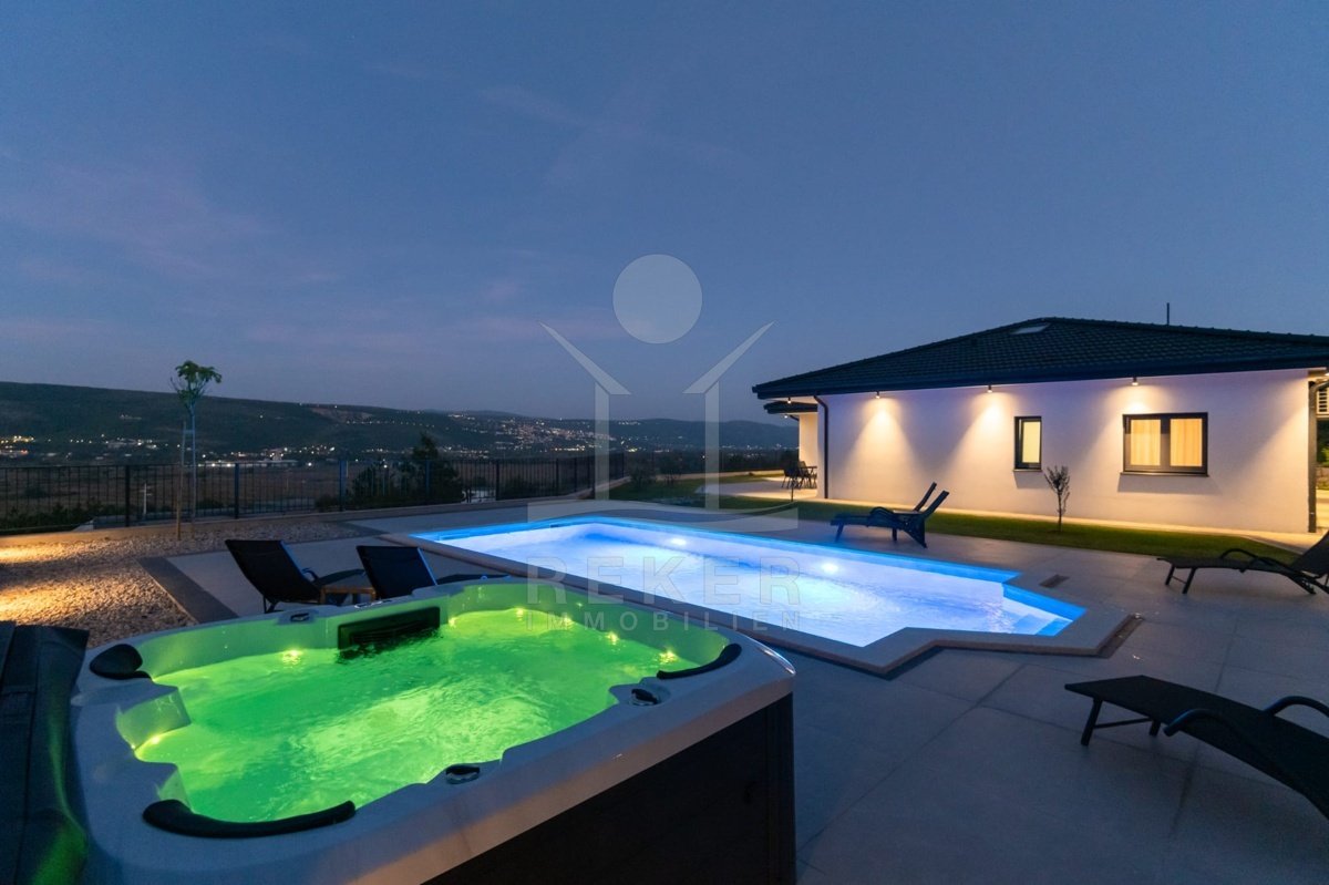 Die großzügige Terrasse ist ein echtes Highlight dieser Villa und bietet einen traumhaften Platz für entspannte Freizeitmomente. Hier befindet sich ein beheizter Pool mit den Maßen 8x4 m, eine Außendusche sowie ein einladender Whirlpool, die alle zum Entspannen und Genießen einladen. Die überdachte Terrasse ist mit stilvollen Gartenmöbeln und einer Außenküche mit Steingrill ausgestattet, wodurch Sie unvergessliche Sommerabende im Freien verbringen können. Mit bis zu 4 Stellplätzen stehen auch Ihre Fahrzeuge stets sicher und bequem zur Verfügung.