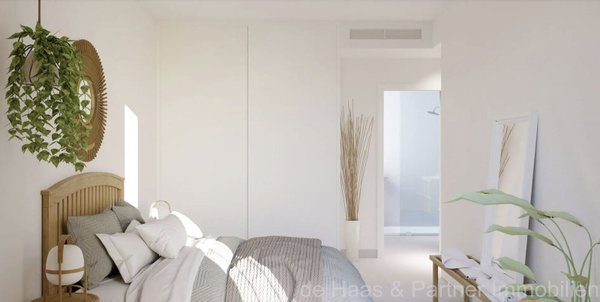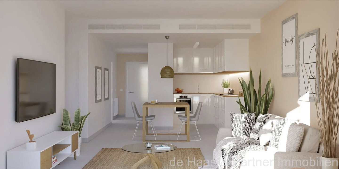 Wohn-/Esszimmer mit Zugang zum Balkon mit Blick auf die Poollandschaft, offene Küche, zwei/drei Schlafzimmer, 2 Bäder, Flur, Hauswirtschaftsraum. Zu jeder Wohnung gehört ein Tiefgaragenstellplatz.