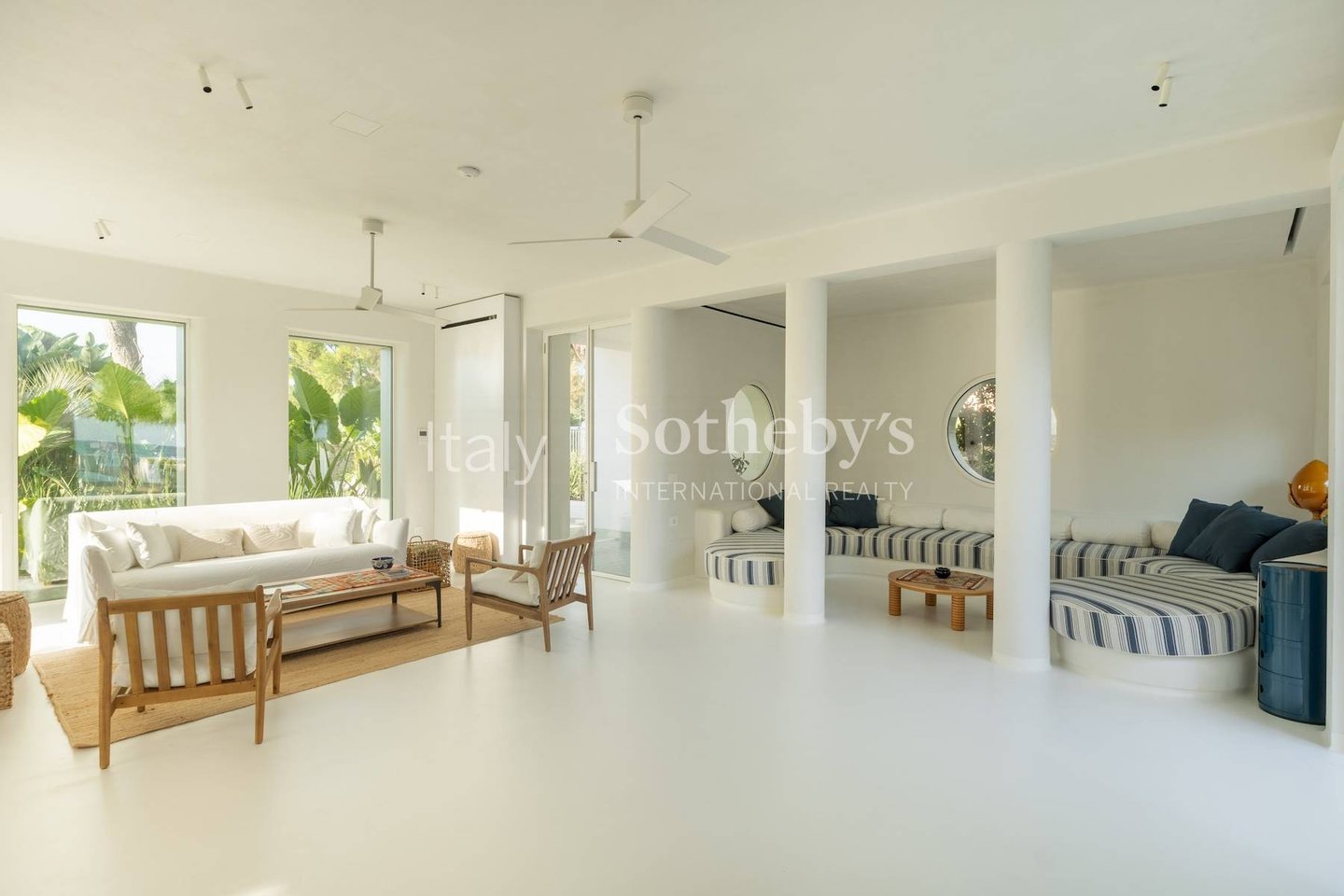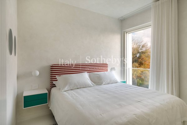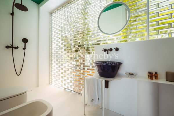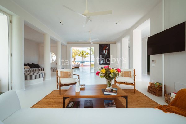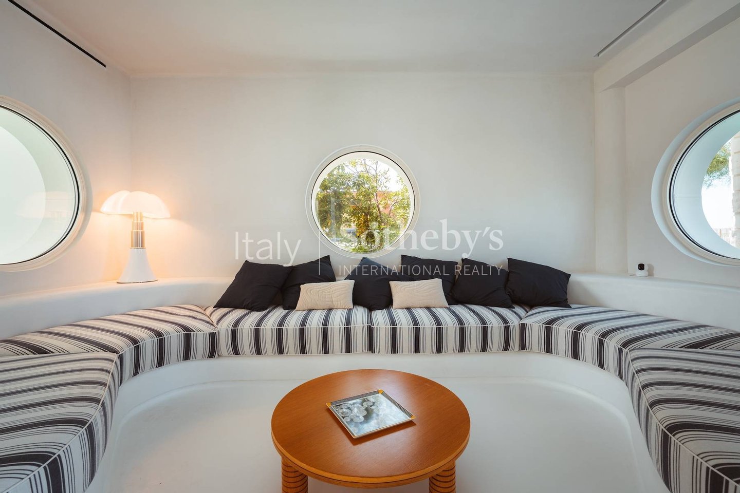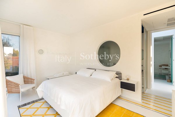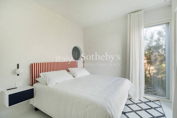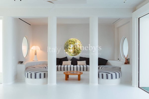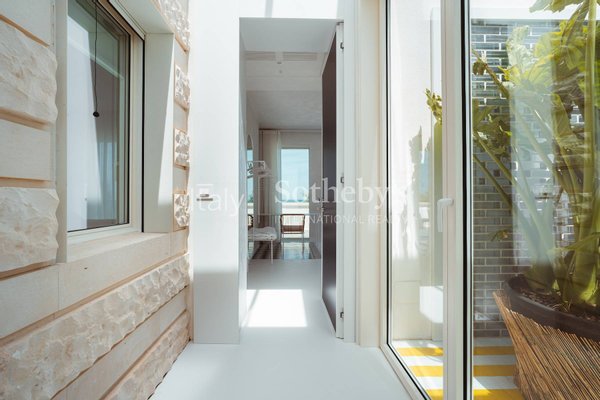 The villa is spread across two levels and features five bedrooms, each with its own en-suite bathroom and contemporary design furnishings inspired by the colors and charm of the sea. The expansive glass walls and signature porthole windows flood the spaces with natural light, offering spectacular views of the Adriatic Sea and creating a bright and welcoming atmosphere.