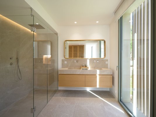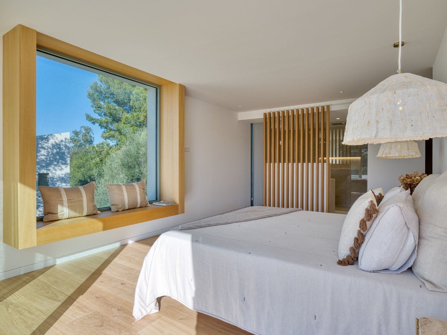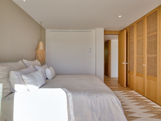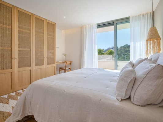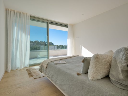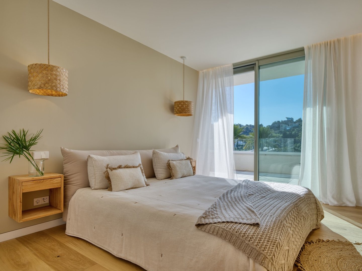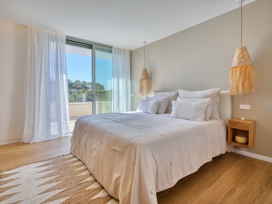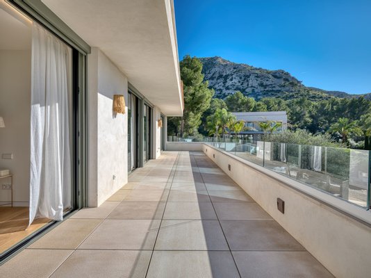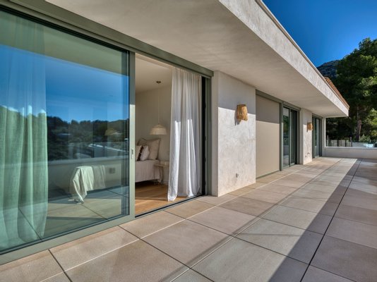 Im Obergeschoss (124 m²) befinden sich 4 Schlafzimmer, 2 mit eigenem Bad und Ankleideraum, und 2 weitere mit gemeinsamem Bad. Genießen Sie den Zugang zu privaten Terrassen mit herrlichem Meer- und Bergblick.
