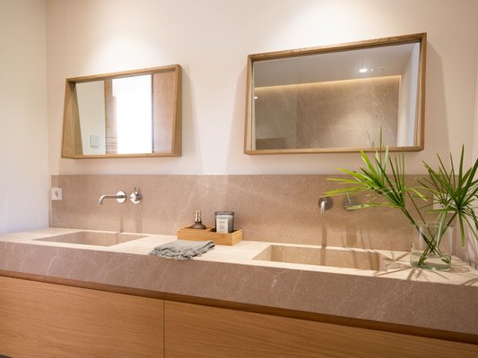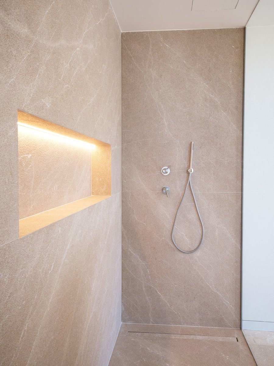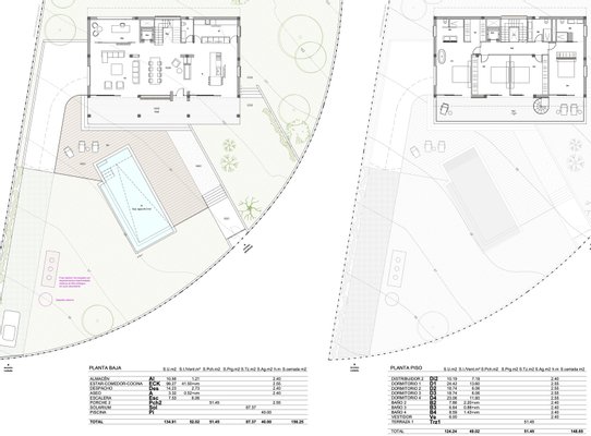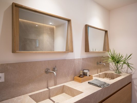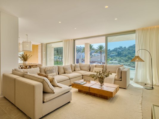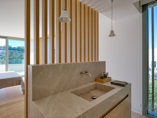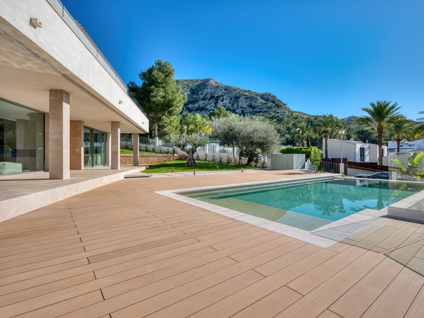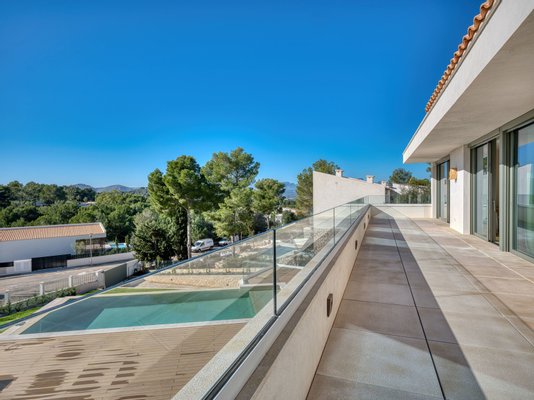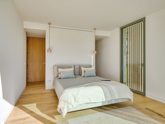 Im Obergeschoss (124 m²) befinden sich 4 Schlafzimmer, 2 mit eigenem Bad und Ankleideraum, und 2 weitere mit gemeinsamem Bad. Genießen Sie den Zugang zu privaten Terrassen mit herrlichem Meer- und Bergblick.