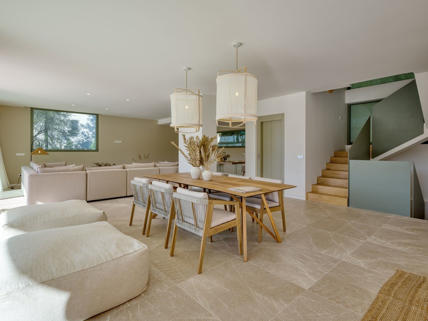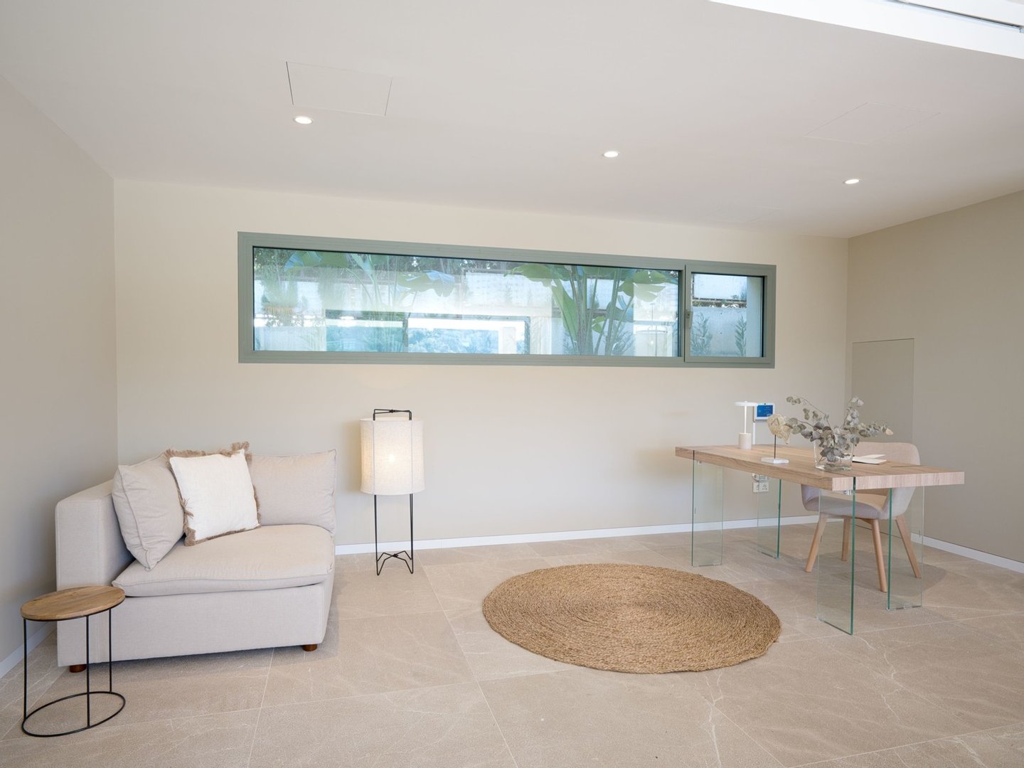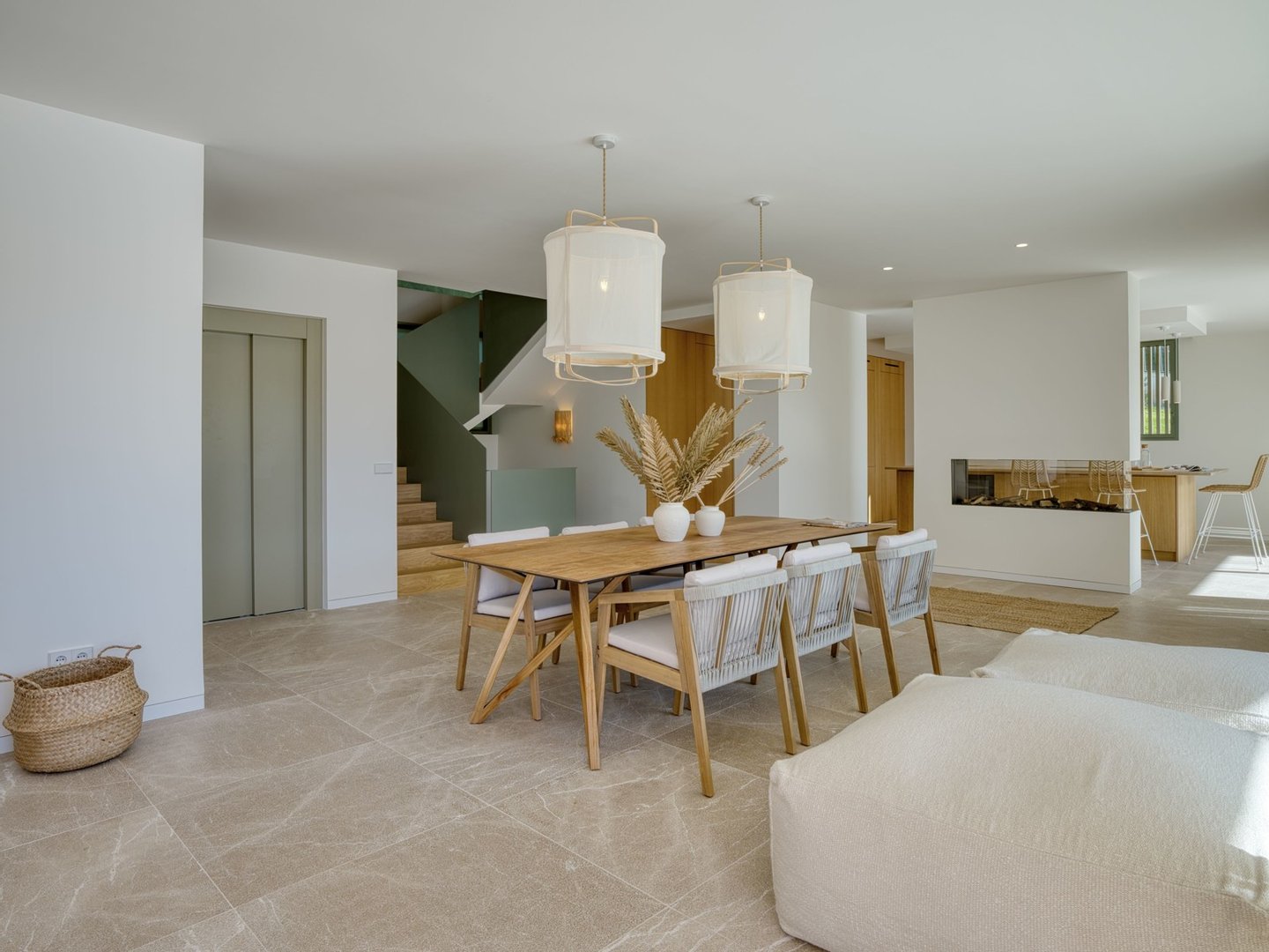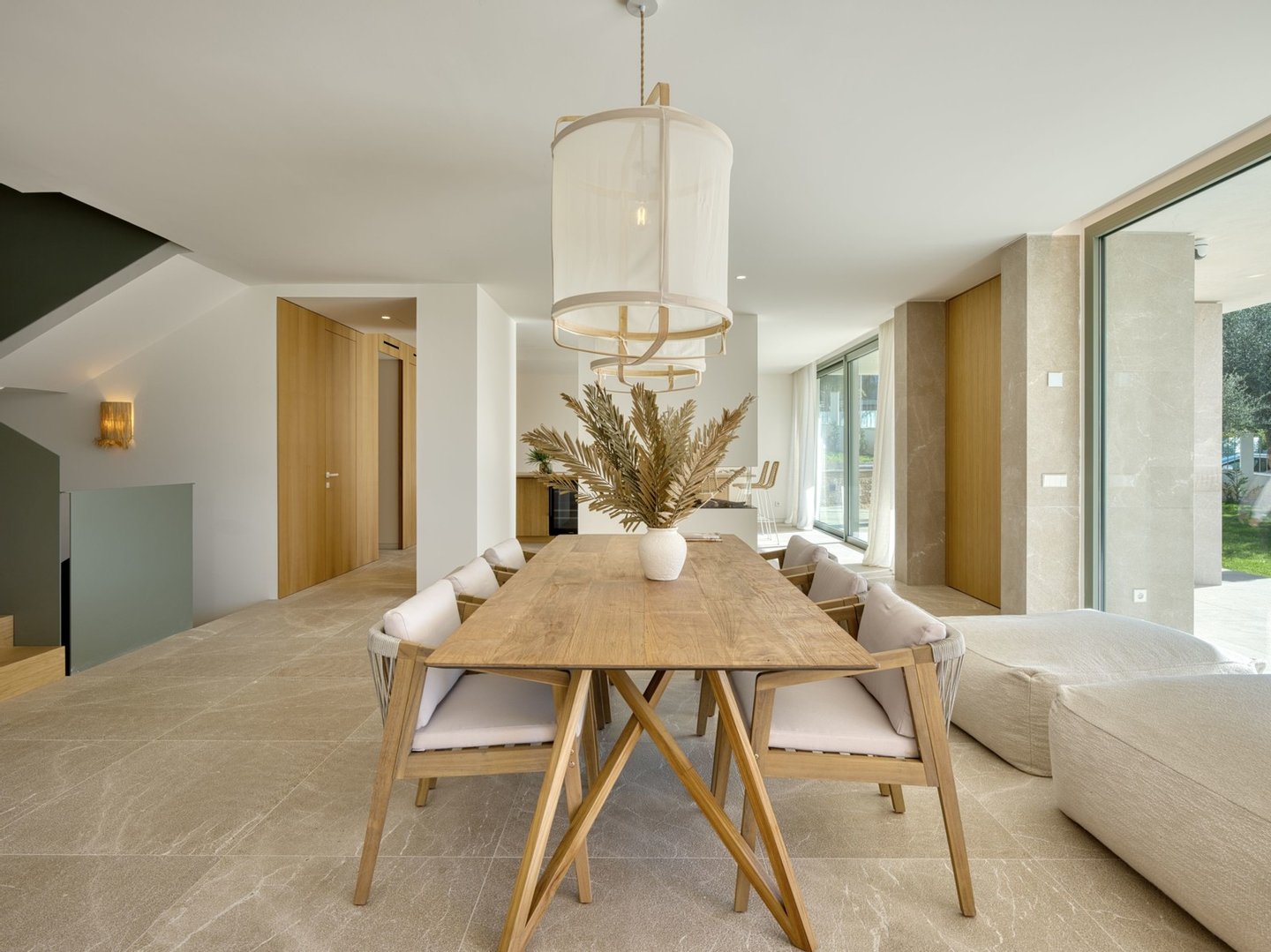 Zur Ausstattung gehören Fußbodenheizung mit aerothermische System, elektrische Jalousien und Bewegungssensoren für zusätzlichen Komfort, hochwertige Materialien wie türkischer Naturstein und Eichenparkett, erstklassige Geräte wie zwei Weinkühler und zwei Siemens-Kühlschränke, ein Wasserenthärter, eingebaute Steckdosen, eine Alarmanlage und die Vorinstallation von Domotik, um das Haus in ein Smart Home zu verwandeln. Designermöbel sind im Verkauf enthalten. Willkommen in Ihrem neuen Zuhause voller Eleganz, Komfort und Technologie.
