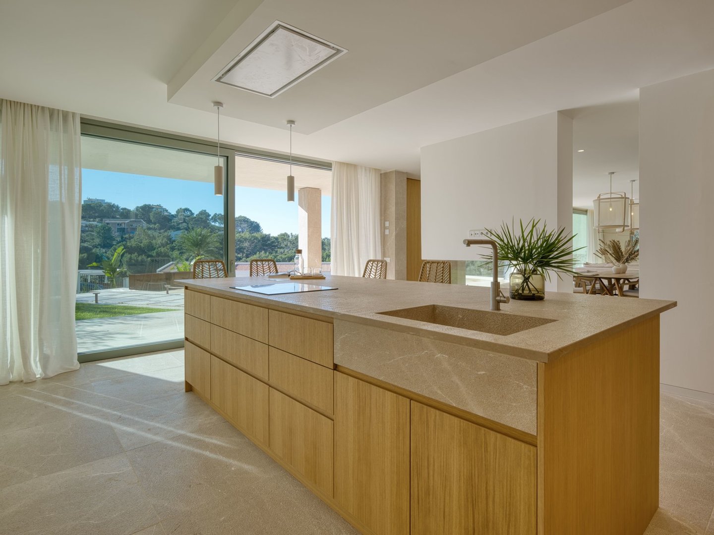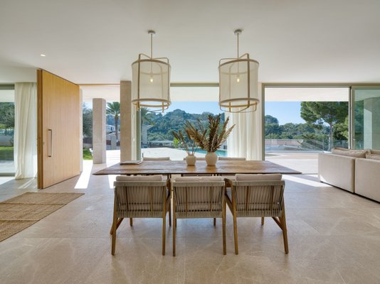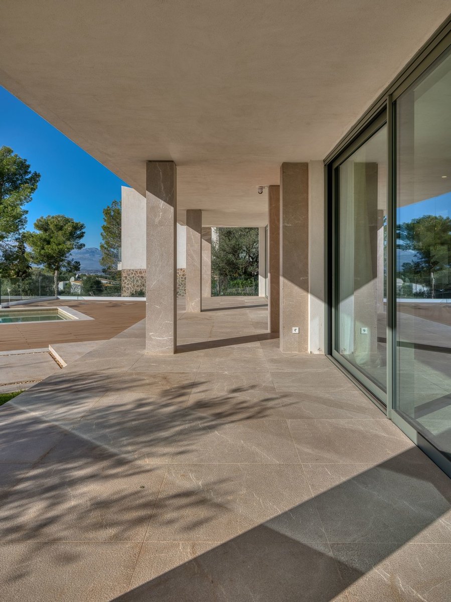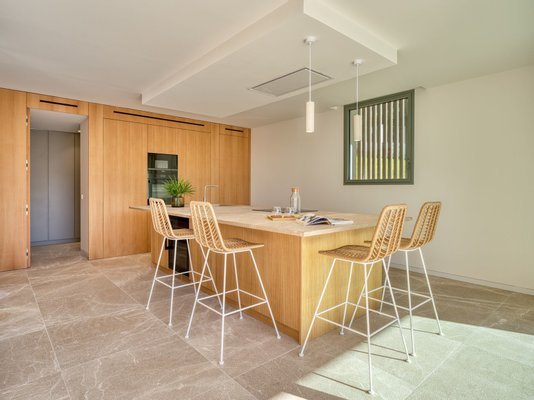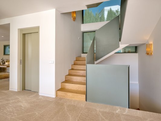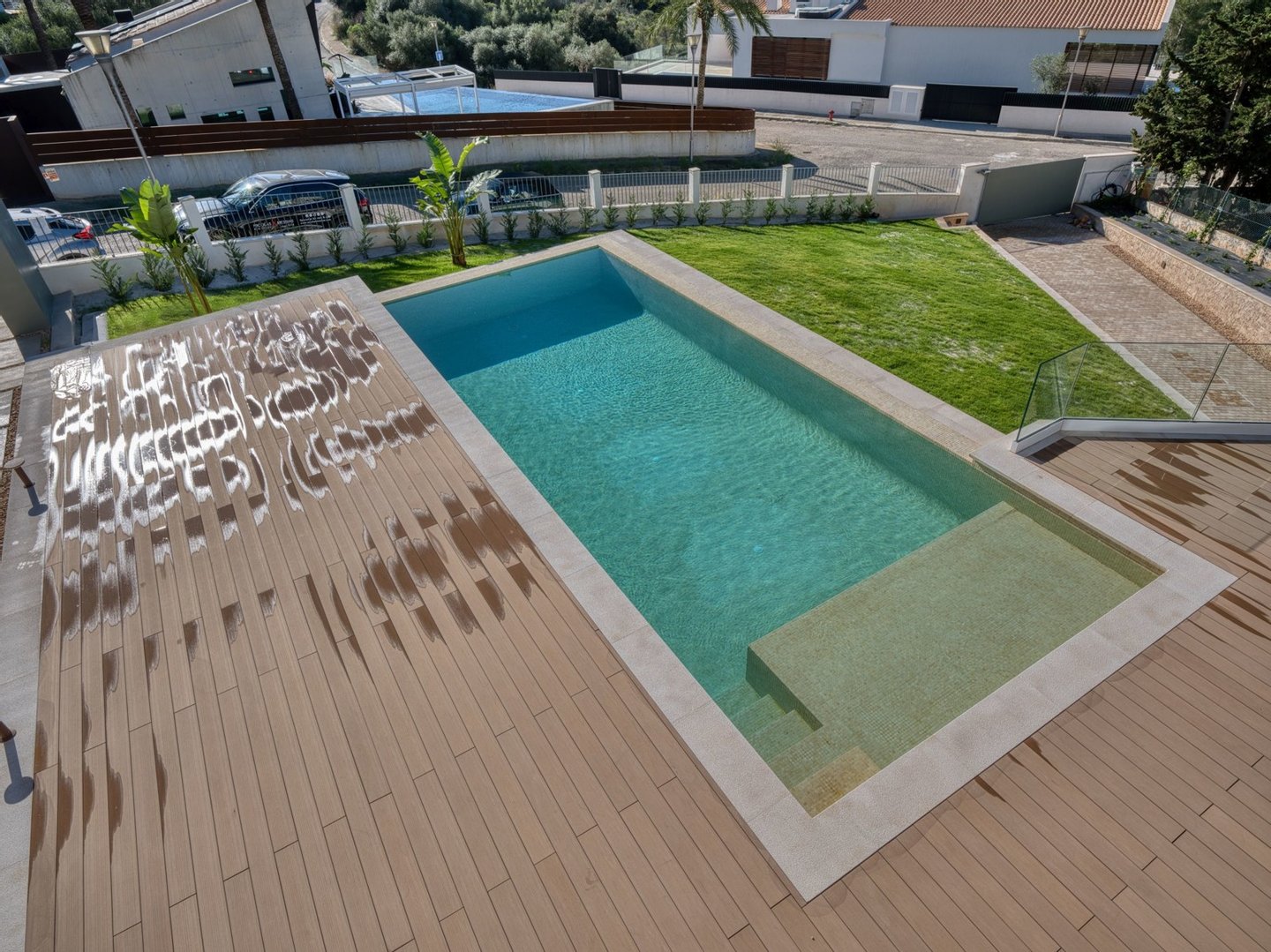 Zur Ausstattung gehören Fußbodenheizung mit aerothermische System, elektrische Jalousien und Bewegungssensoren für zusätzlichen Komfort, hochwertige Materialien wie türkischer Naturstein und Eichenparkett, erstklassige Geräte wie zwei Weinkühler und zwei Siemens-Kühlschränke, ein Wasserenthärter, eingebaute Steckdosen, eine Alarmanlage und die Vorinstallation von Domotik, um das Haus in ein Smart Home zu verwandeln. Designermöbel sind im Verkauf enthalten. Willkommen in Ihrem neuen Zuhause voller Eleganz, Komfort und Technologie.
