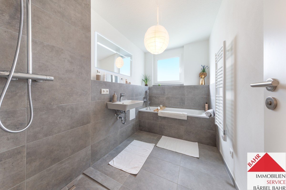 - Tageslichtbad mit Badewanne und bodengleich gefliester Dusche