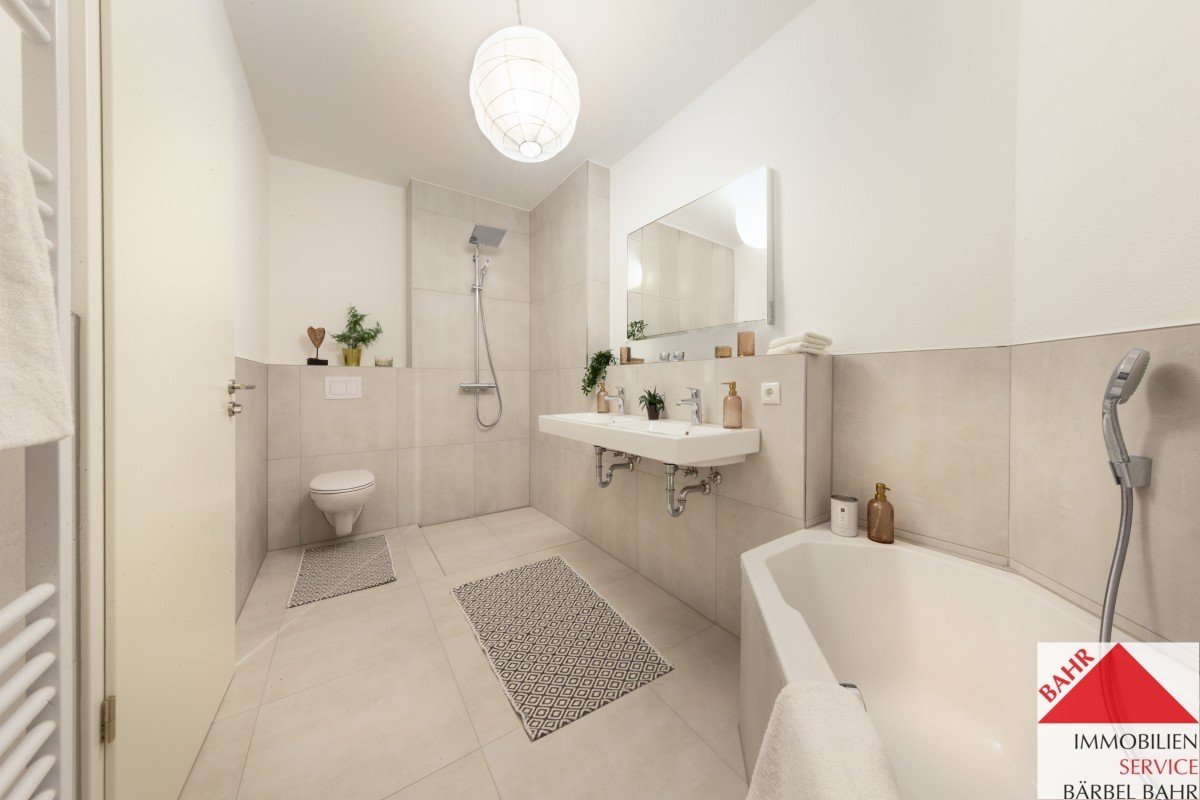 - Bad mit Doppelwaschbecken, Badewanne und bodengleich gefliester Dusche