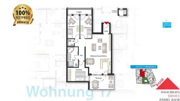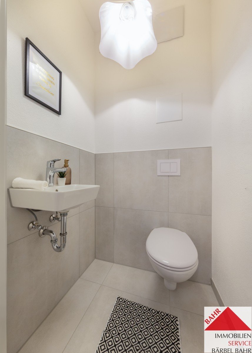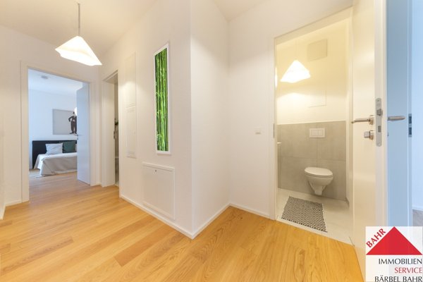 Ein Bad mit Badewanne und bodengleicher Dusche sowie ein separates Gäste-WC vervollständigen diese durchdachte Wohnung. Zusätzlich verfügt die Wohnung über eine Loggia, die Ihnen weitere Möglichkeiten zum Entspannen und Wohlfühlen bietet.