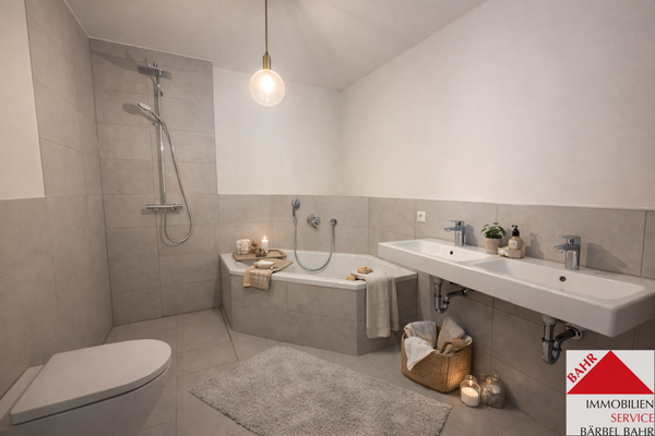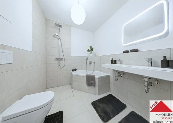 - Bad mit Doppelwaschbecken, Badewanne und bodengleich gefliester Dusche