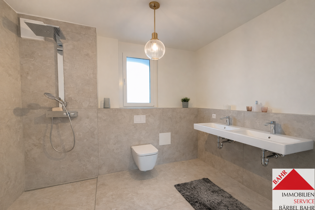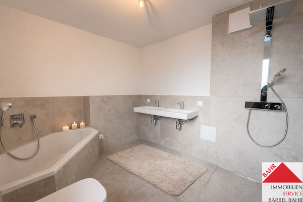 - Tageslichtbad mit Doppelwaschbecken, Badewanne und bodengleich gefliester Dusche