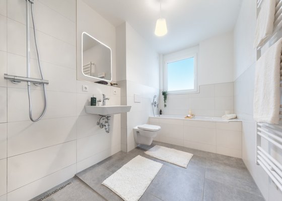 - Tageslichtbad mit Badewanne und bodengleich gefliester Dusche