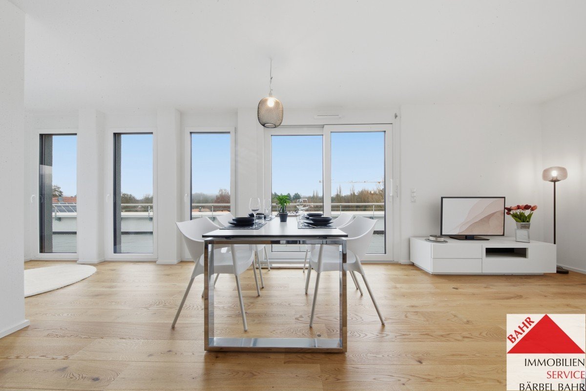 Das Zentrum der Wohnung bildet der großzügige Wohn- und Essbereich mit integrierter offener Küche, der zum Kochen und Verweilen mit Freunden und Familie einlädt.