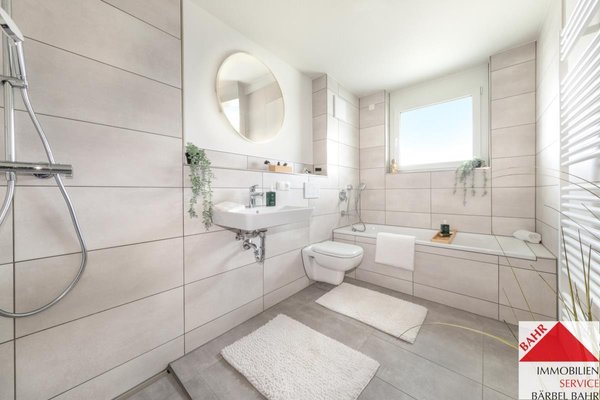 - Tageslichtbad mit Badewanne und bodengleich gefliester Dusche