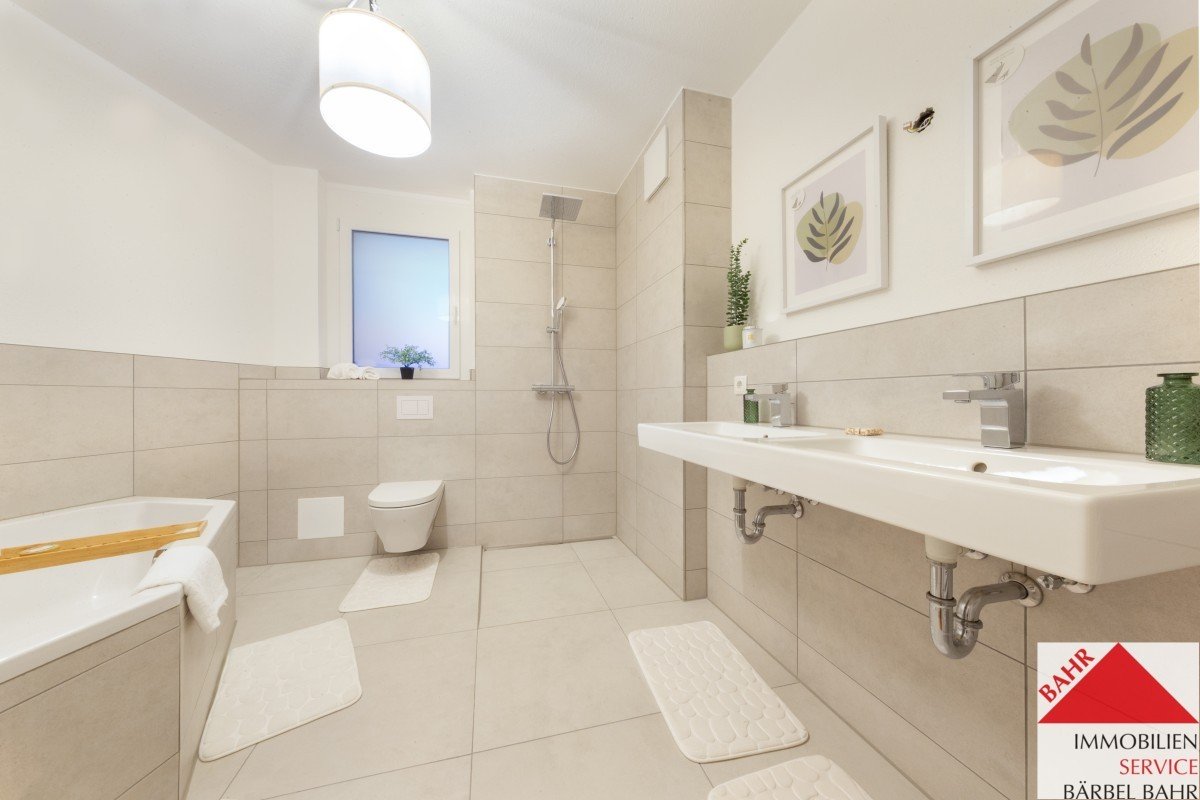 - Tageslichtbad mit Doppelwaschbecken, Badewanne & bodengleich gefliester Dusche