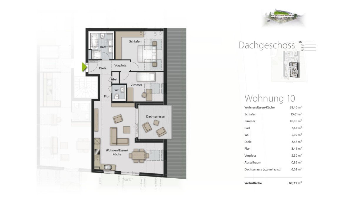 Hell und groß, mit vielen Fenstern und durchdachter Raumaufteilung findet alles seinen Platz. Um dieses Zentrum herum sind die weiteren Räume angeordnet. Ein Schlafzimmer mit üppig Platz für Schränke, ein Zimmer mit gemütlicher Schräge – als Kinder-, Gästezimmer oder Homeoffice bestens geeignet. Das Tageslichtbad und ein separates Gäste-WC ergänzen das Raumangebot. Ein goldwerter Abstellraum in der Wohnung macht das Angebot komplett.