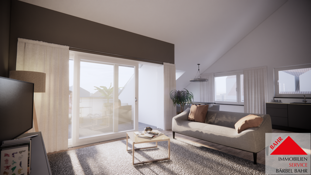Das Zentrum der Wohnung bildet der luftige Wohn-/ Essbereich mit integrierter offener Küche sowie der herrlich große Dachbalkon. Hier lässt sich der Feierabend genießen.