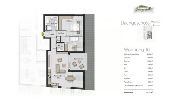Das Zentrum der Wohnung bildet der luftige Wohn-/ Essbereich mit integrierter offener Küche sowie der herrlich große Dachbalkon. Hier lässt sich der Feierabend genießen.