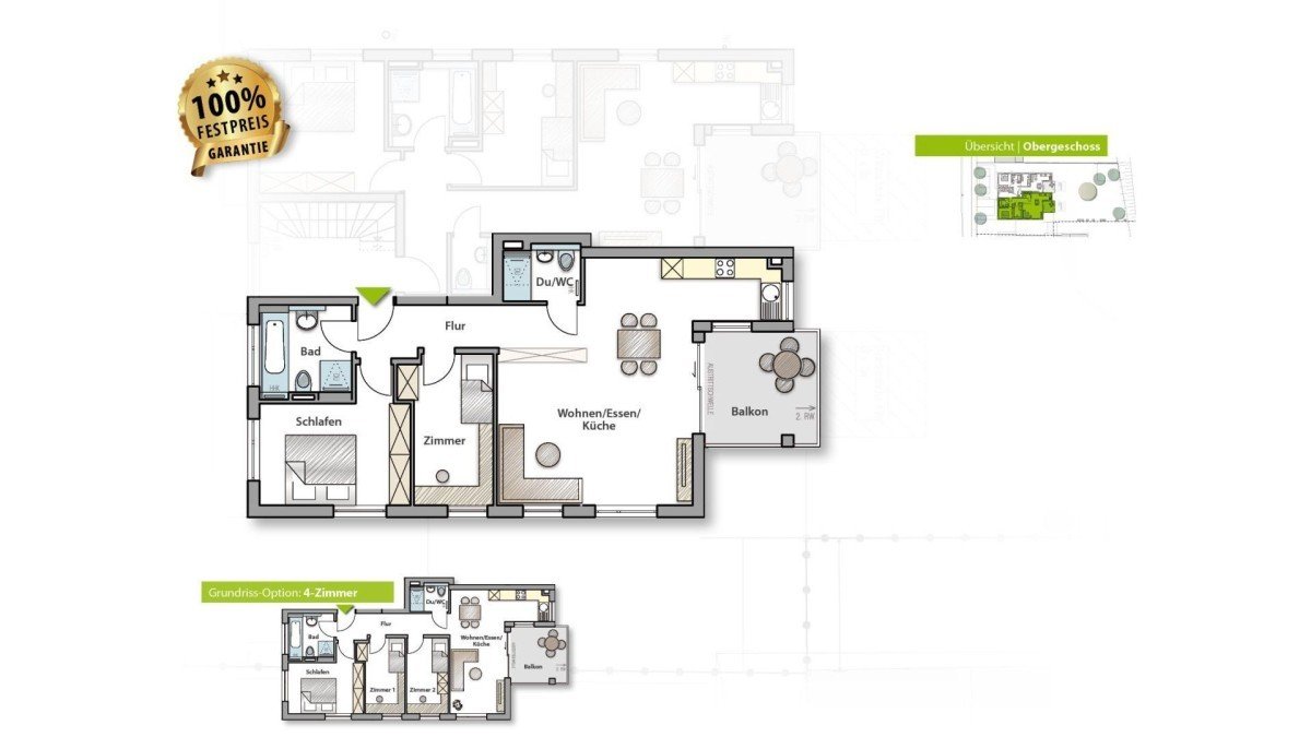 Sie benötigen eher eine 4-Zimmer-Wohnung? Dieser Grundriss kann auch noch alternativ mit 4-Zimmern ausgeführt werden.
