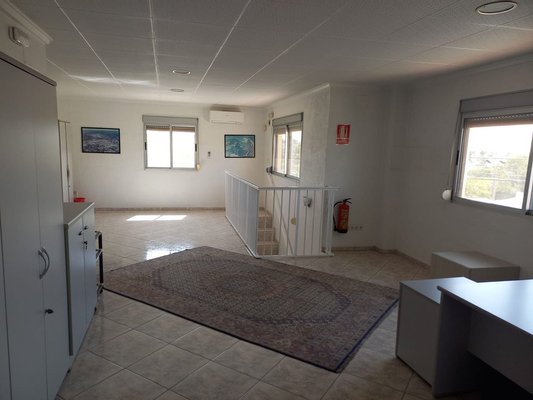 das Obergeschoss mit 2 Schlafzimmern, 1 Badezimmer mit Dusche und 1 sehr großen Wohnbereich mit Kitchenette und Meerblick.