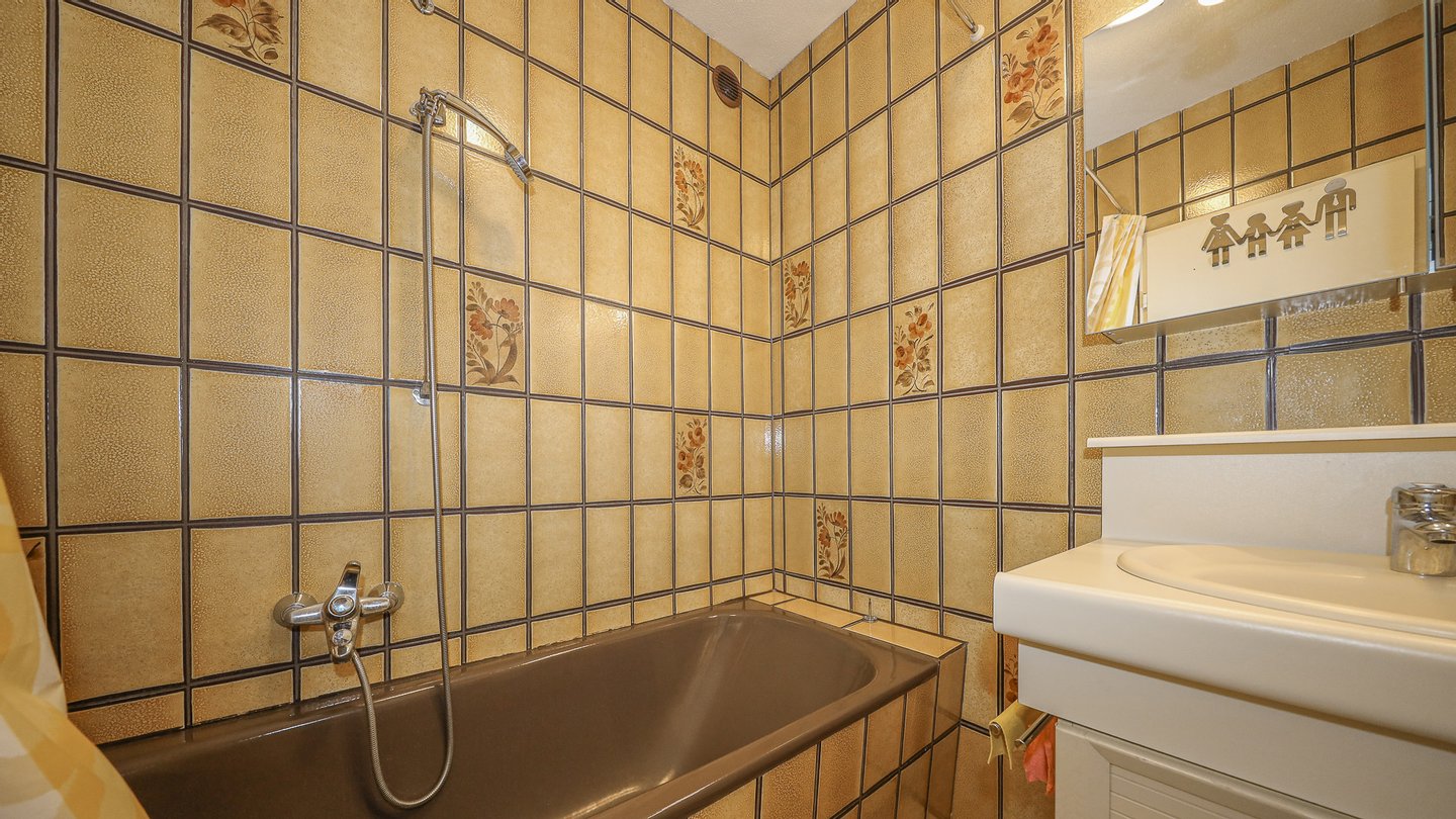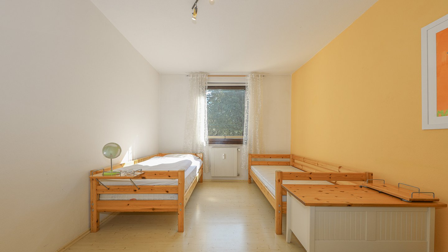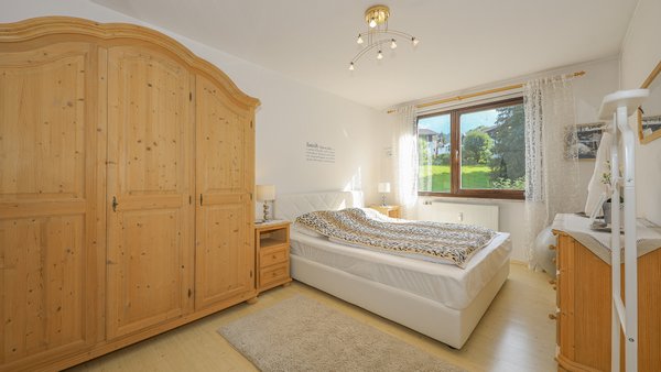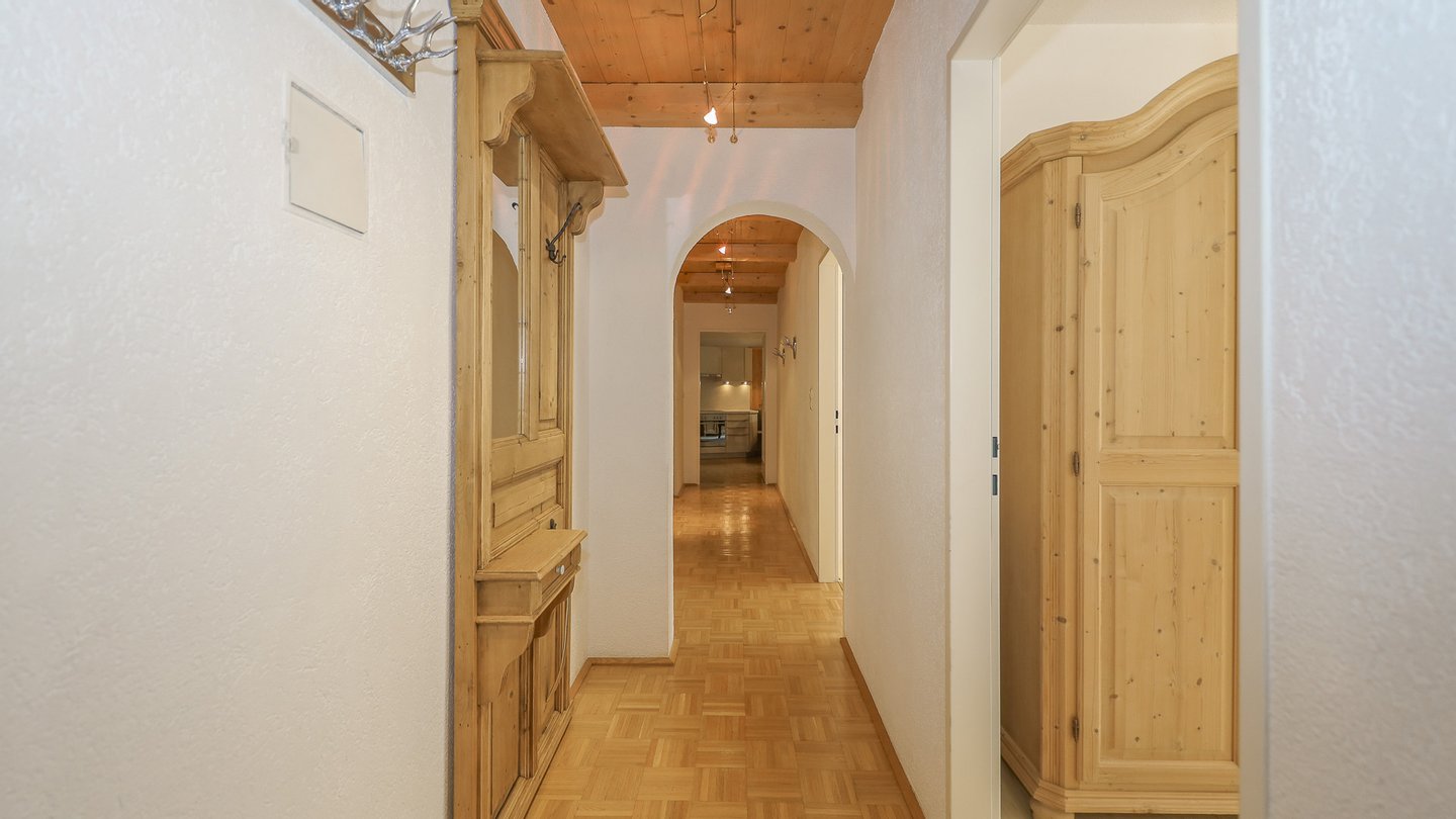 Eingangsbereich mit Garderobe, welcher in den Flur mündet, eine separate Toilette, drei Schlafzimmer, ein Badezimmer mit Badewanne und Waschmaschine, Küche mit Essbereich und Abstellraum sowie Wohnraum mit Kachelofen, von welchem man auf den Balkon gelangt.