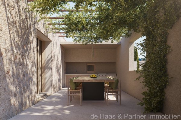 Der Gartenbereich ist mediterran mit altem und neuen Baumbestand erhalten.