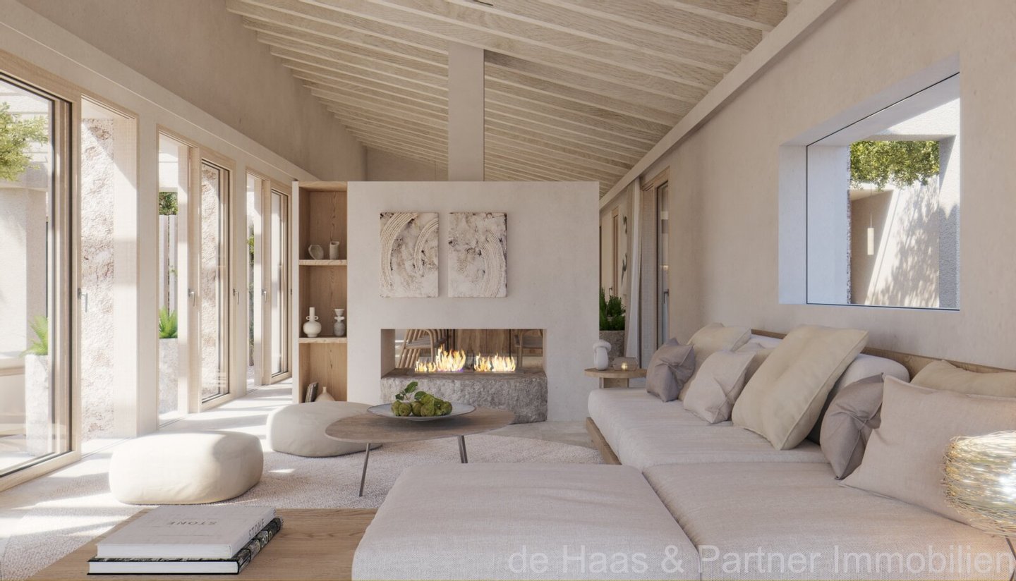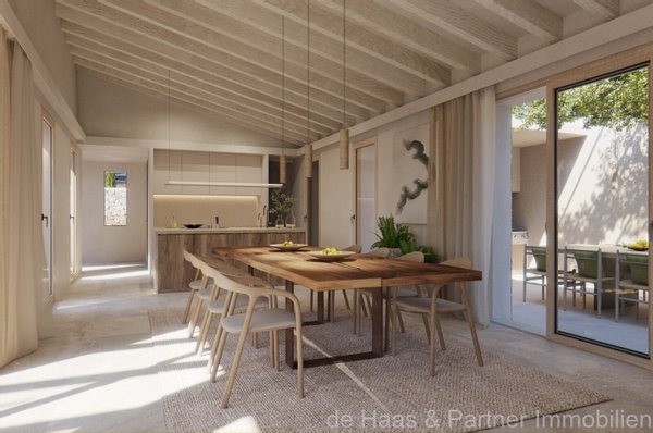 Beim Bau der Finca wurden viele mallorquinische Elemente wie Natursteinwände und sichtbare Deckenbalken eingearbeitet.